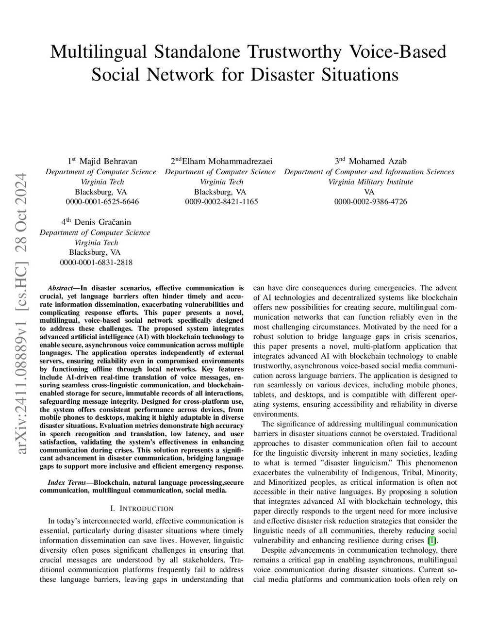 In disaster scenarios, effective communication is crucial, yet language barriers often hinder timely and accurate information dissemination, exacerbating vulnerabilities and complicating response efforts. This paper presents a novel, multilingual, voice-based social network specifically designed to address these challenges. The proposed system integrates advanced artificial intelligence (AI) with blockchain technology to enable secure, asynchronous voice communication across multiple languages. The application operates independently of external servers, ensuring reliability even in compromised environments by functioning offline through local networks. Key features include AI-driven real-time translation of voice messages, ensuring seamless cross-linguistic communication, and blockchain-enabled storage for secure, immutable records of all interactions, safeguarding message integrity. Designed for cross-platform use, the system offers consistent performance across devices, from mobile phones to desktops, making it highly adaptable in diverse disaster situations. Evaluation metrics demonstrate high accuracy in speech recognition and translation, low latency, and user satisfaction, validating the system's effectiveness in enhancing communication during crises. This solution represents a significant advancement in disaster communication, bridging language gaps to support more inclusive and efficient emergency response.