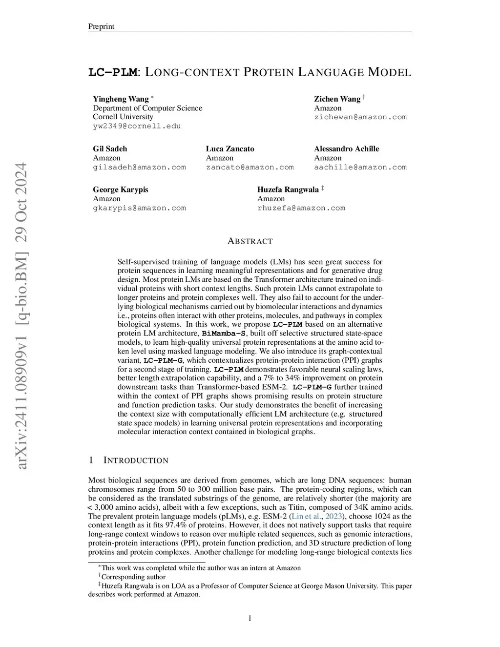 Self-supervised training of language models (LMs) has seen great success for protein sequences in learning meaningful representations and for generative drug design. Most protein LMs are based on the Transformer architecture trained on individual proteins with short context lengths. Such protein LMs cannot extrapolate to longer proteins and protein complexes well. They also fail to account for the underlying biological mechanisms carried out by biomolecular interactions and dynamics i.e., proteins often interact with other proteins, molecules, and pathways in complex biological systems. In this work, we propose LC-PLM based on an alternative protein LM architecture, BiMamba-S, built upon selective structured state-space models, to learn high-quality universal protein representations at the amino acid token level using masked language modeling. We also introduce its graph-contextual variant, LC-PLM, which contextualizes protein-protein interaction (PPI) graphs for a second stage of training. LC-PLM demonstrates favorable neural scaling laws, better length extrapolation capability, and up to 30% and 16% improvements on protein downstream tasks compared to Transformer-based ESM-2 when trained with 100B and 1T tokens, respectively. LC-PLM-G further trained within the context of PPI graphs shows promising results on protein structure and function prediction tasks. Our study demonstrates the benefit of increasing the context size with computationally efficient LM architecture (e.g., structured state space models) in learning universal protein representations and incorporating molecular interaction contexts contained in biological graphs.