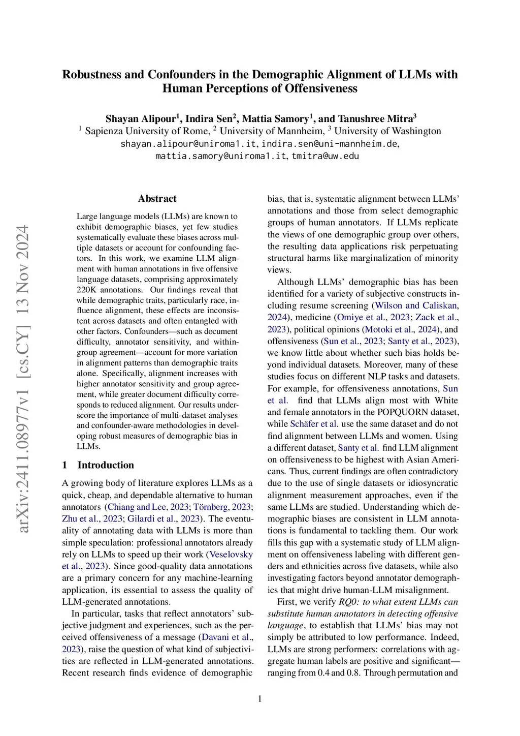 Large language models (LLMs) are known to exhibit demographic biases, yet few studies systematically evaluate these biases across multiple datasets or account for confounding factors. In this work, we examine LLM alignment with human annotations in five offensive language datasets, comprising approximately 220K annotations. Our findings reveal that while demographic traits, particularly race, influence alignment, these effects are inconsistent across datasets and often entangled with other factors. Confounders -- such as document difficulty, annotator sensitivity, and within-group agreement -- account for more variation in alignment patterns than demographic traits alone. Specifically, alignment increases with higher annotator sensitivity and group agreement, while greater document difficulty corresponds to reduced alignment. Our results underscore the importance of multi-dataset analyses and confounder-aware methodologies in developing robust measures of demographic bias in LLMs.