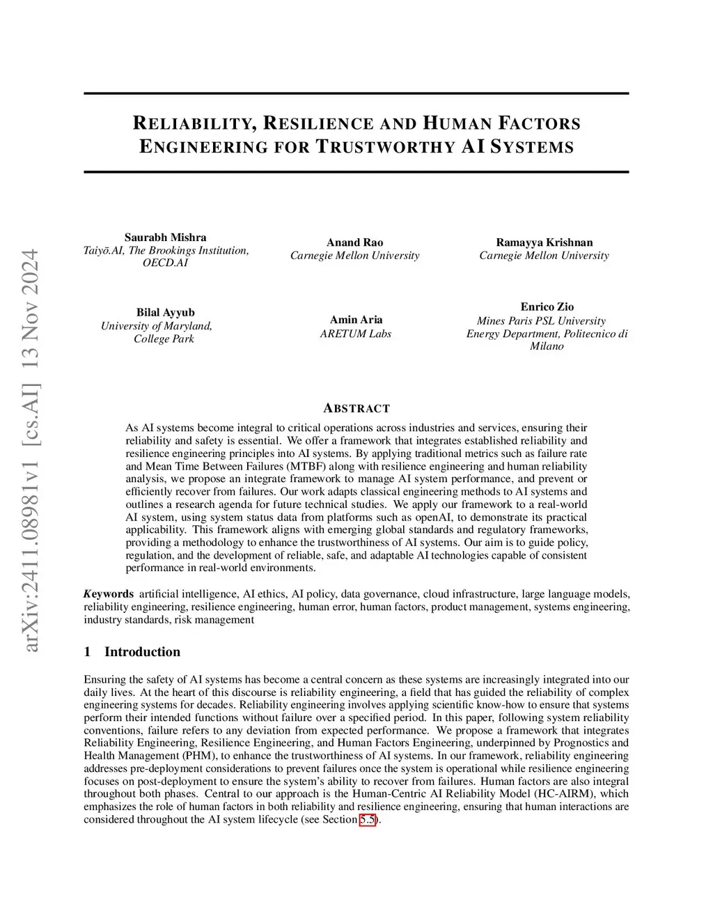 Reliability, Resilience and Human Factors Engineering for Trustworthy AI