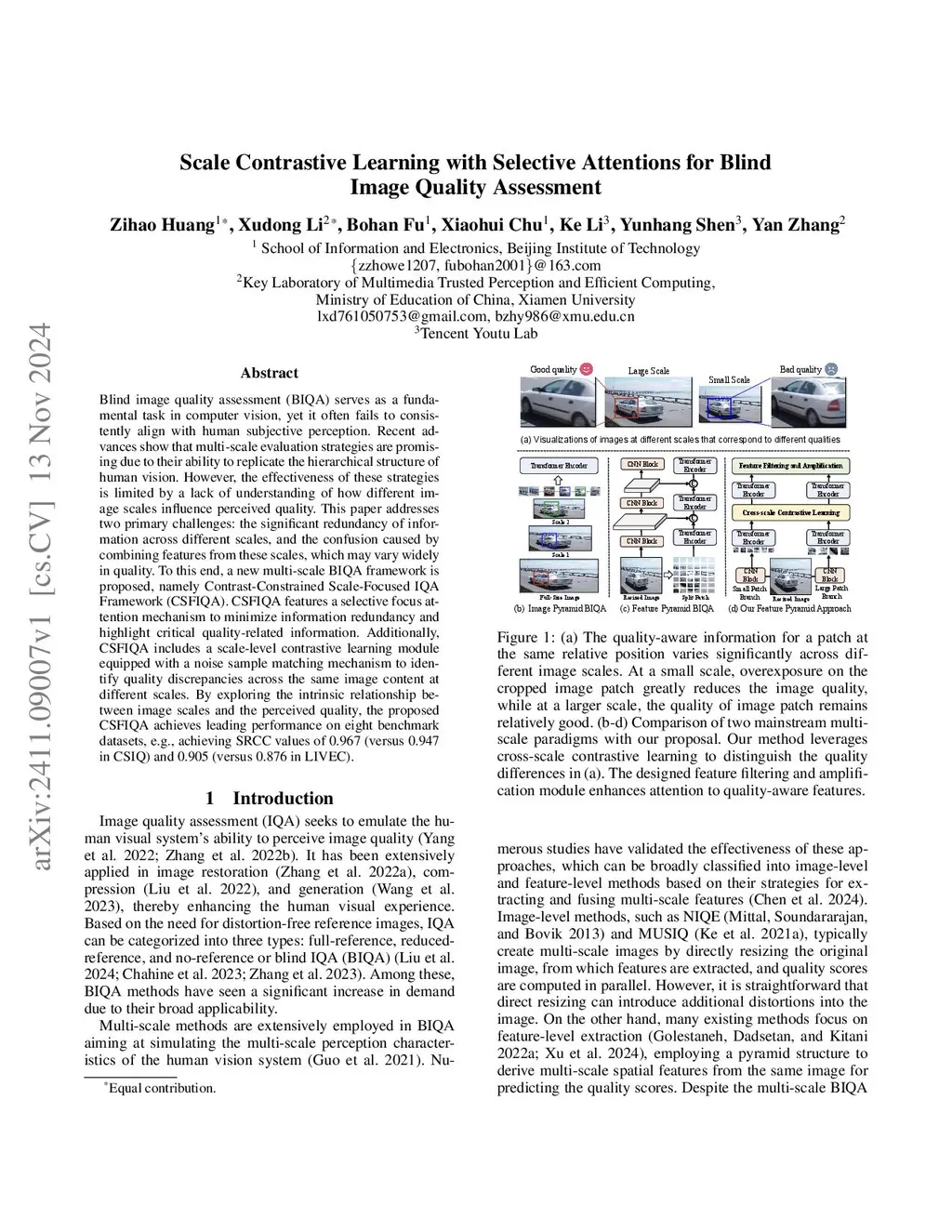 Scale Contrastive Learning with Selective Attentions for Blind Image Quality Assessment