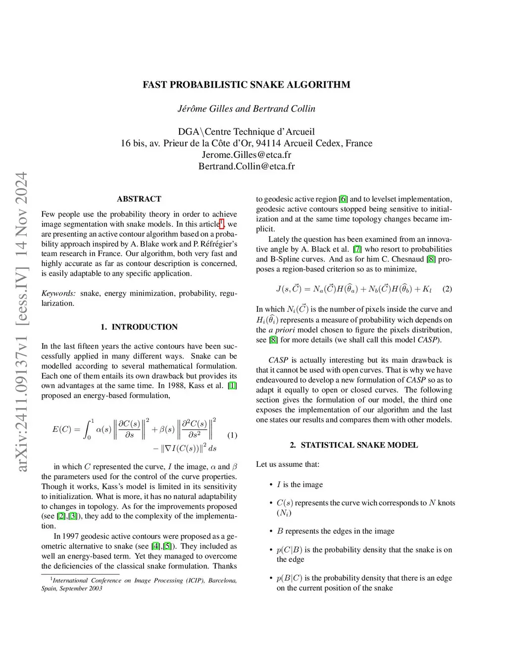 Few people use the probability theory in order to achieve image segmentation with snake models. In this article, we are presenting an active contour algorithm based on a probability approach inspired by A. Blake work and P. R{\é}fr{\é}gier's team research in France. Our algorithm, both very fast and highly accurate as far as contour description is concerned, is easily adaptable to any specific application.