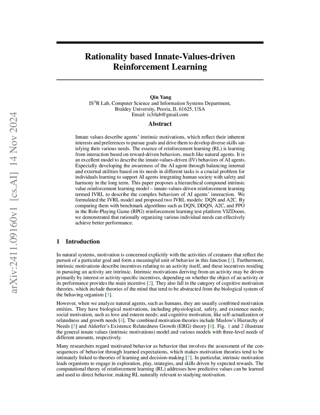 Innate values describe agents' intrinsic motivations, which reflect their inherent interests and preferences for pursuing goals and drive them to develop diverse skills that satisfy their various needs. Traditional reinforcement learning (RL) is learning from interaction based on the feedback rewards of the environment. However, in real scenarios, the rewards are generated by agents' innate value systems, which differ vastly from individuals based on their needs and requirements. In other words, considering the AI agent as a self-organizing system, developing its awareness through balancing internal and external utilities based on its needs in different tasks is a crucial problem for individuals learning to support others and integrate community with safety and harmony in the long term. To address this gap, we propose a new RL model termed innate-values-driven RL (IVRL) based on combined motivations' models and expected utility theory to mimic its complex behaviors in the evolution through decision-making and learning. Then, we introduce two IVRL-based models: IV-DQN and IV-A2C. By comparing them with benchmark algorithms such as DQN, DDQN, A2C, and PPO in the Role-Playing Game (RPG) reinforcement learning test platform VIZDoom, we demonstrated that the IVRL-based models can help the agent rationally organize various needs, achieve better performance effectively.
