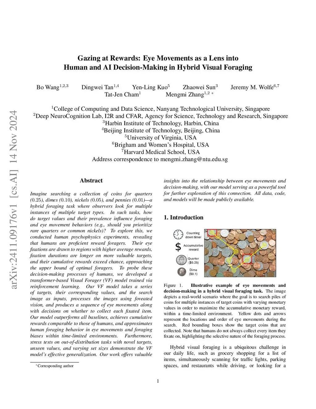 Imagine searching a collection of coins for quarters (), dimes (), nickels (), and pennies ()-a hybrid foraging task where observers look for multiple instances of multiple target types. In such tasks, how do target values and their prevalence influence foraging and eye movement behaviors (e.g., should you prioritize rare quarters or common nickels)? To explore this, we conducted human psychophysics experiments, revealing that humans are proficient reward foragers. Their eye fixations are drawn to regions with higher average rewards, fixation durations are longer on more valuable targets, and their cumulative rewards exceed chance, approaching the upper bound of optimal foragers. To probe these decision-making processes of humans, we developed a transformer-based Visual Forager (VF) model trained via reinforcement learning. Our VF model takes a series of targets, their corresponding values, and the search image as inputs, processes the images using foveated vision, and produces a sequence of eye movements along with decisions on whether to collect each fixated item. Our model outperforms all baselines, achieves cumulative rewards comparable to those of humans, and approximates human foraging behavior in eye movements and foraging biases within time-limited environments. Furthermore, stress tests on out-of-distribution tasks with novel targets, unseen values, and varying set sizes demonstrate the VF model's effective generalization. Our work offers valuable insights into the relationship between eye movements and decision-making, with our model serving as a powerful tool for further exploration of this connection. All data, code, and models are available atthis https URL.