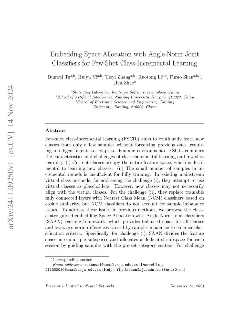 Few-shot class-incremental learning (FSCIL) aims to continually learn new classes from only a few samples without forgetting previous ones, requiring intelligent agents to adapt to dynamic environments. FSCIL combines the characteristics and challenges of class-incremental learning and few-shot learning: (i) Current classes occupy the entire feature space, which is detrimental to learning new classes. (ii) The small number of samples in incremental rounds is insufficient for fully training. In existing mainstream virtual class methods, for addressing the challenge (i), they attempt to use virtual classes as placeholders. However, new classes may not necessarily align with the virtual classes. For the challenge (ii), they replace trainable fully connected layers with Nearest Class Mean (NCM) classifiers based on cosine similarity, but NCM classifiers do not account for sample imbalance issues. To address these issues in previous methods, we propose the class-center guided embedding Space Allocation with Angle-Norm joint classifiers (SAAN) learning framework, which provides balanced space for all classes and leverages norm differences caused by sample imbalance to enhance classification criteria. Specifically, for challenge (i), SAAN divides the feature space into multiple subspaces and allocates a dedicated subspace for each session by guiding samples with the pre-set category centers. For challenge (ii), SAAN establishes a norm distribution for each class and generates angle-norm joint logits. Experiments demonstrate that SAAN can achieve state-of-the-art performance and it can be directly embedded into other SOTA methods as a plug-in, further enhancing their performance.