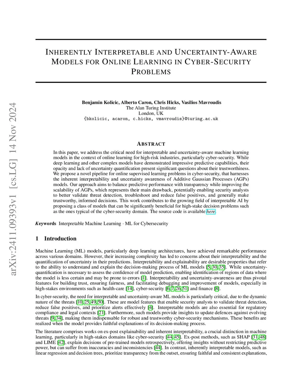 In this paper, we address the critical need for interpretable and uncertainty-aware machine learning models in the context of online learning for high-risk industries, particularly cyber-security. While deep learning and other complex models have demonstrated impressive predictive capabilities, their opacity and lack of uncertainty quantification present significant questions about their trustworthiness. We propose a novel pipeline for online supervised learning problems in cyber-security, that harnesses the inherent interpretability and uncertainty awareness of Additive Gaussian Processes (AGPs) models. Our approach aims to balance predictive performance with transparency while improving the scalability of AGPs, which represents their main drawback, potentially enabling security analysts to better validate threat detection, troubleshoot and reduce false positives, and generally make trustworthy, informed decisions. This work contributes to the growing field of interpretable AI by proposing a class of models that can be significantly beneficial for high-stake decision problems such as the ones typical of the cyber-security domain. The source code is available.
