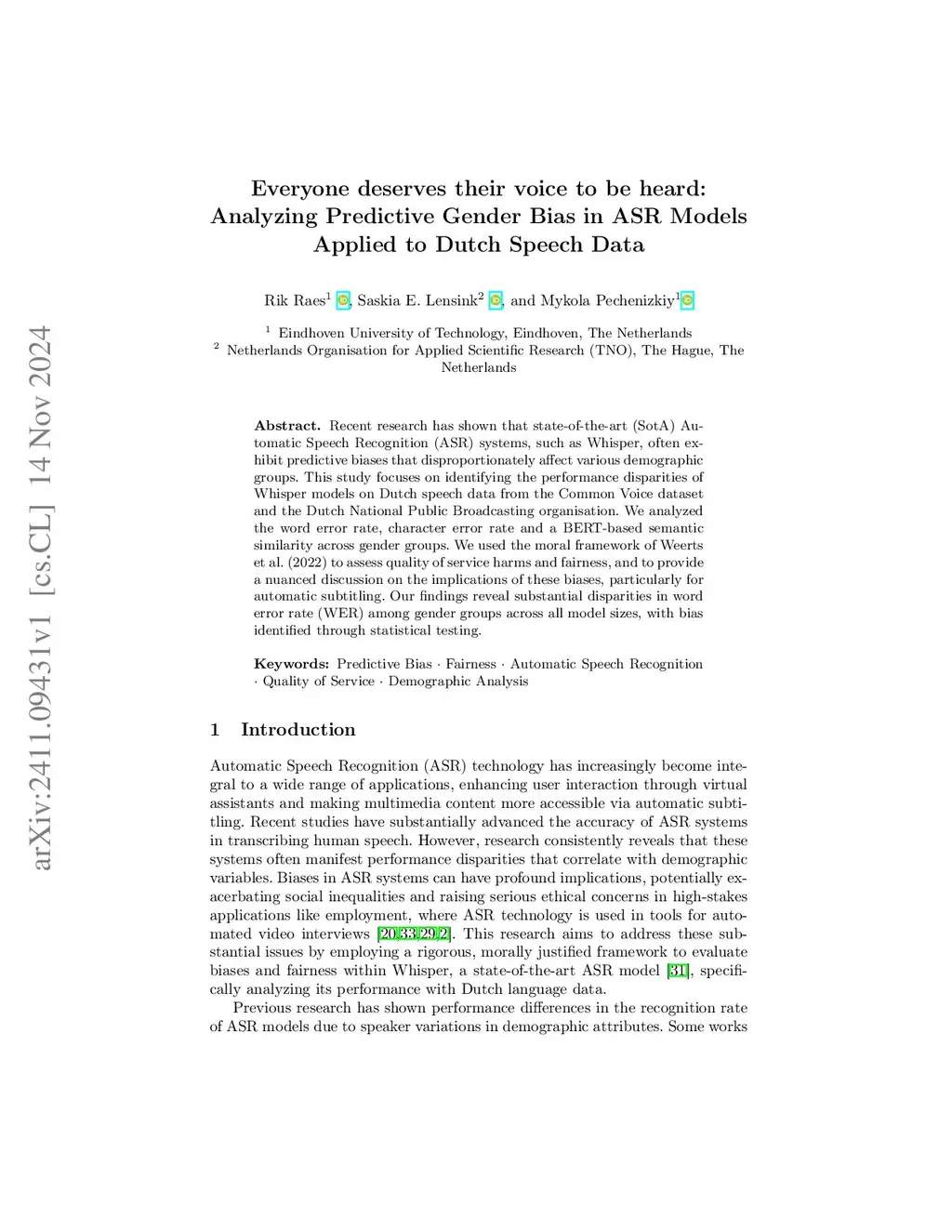 Recent research has shown that state-of-the-art (SotA) Automatic Speech Recognition (ASR) systems, such as Whisper, often exhibit predictive biases that disproportionately affect various demographic groups. This study focuses on identifying the performance disparities of Whisper models on Dutch speech data from the Common Voice dataset and the Dutch National Public Broadcasting organisation. We analyzed the word error rate, character error rate and a BERT-based semantic similarity across gender groups. We used the moral framework of Weerts et al. (2022) to assess quality of service harms and fairness, and to provide a nuanced discussion on the implications of these biases, particularly for automatic subtitling. Our findings reveal substantial disparities in word error rate (WER) among gender groups across all model sizes, with bias identified through statistical testing.