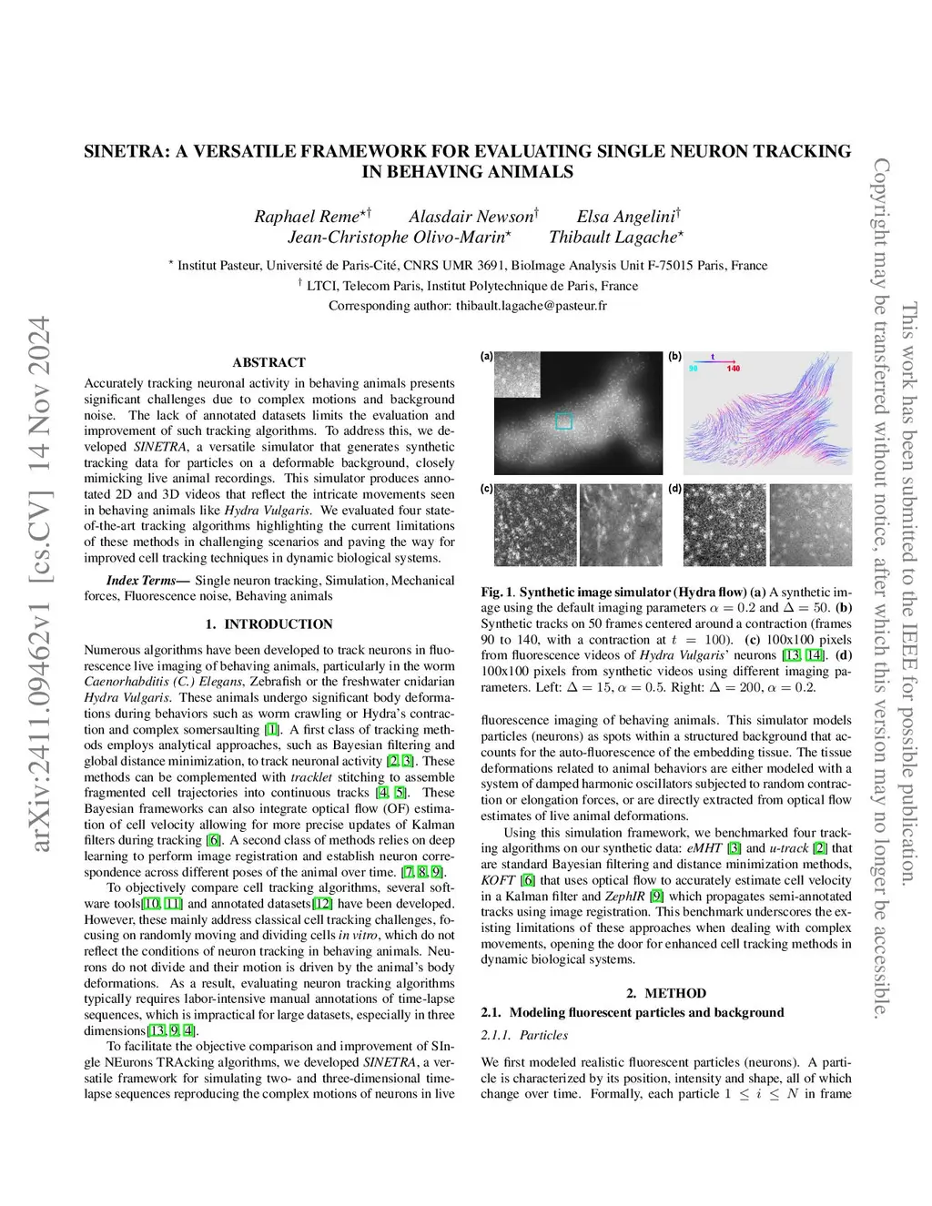 Accurately tracking neuronal activity in behaving animals presents significant challenges due to complex motions and background noise. The lack of annotated datasets limits the evaluation and improvement of such tracking algorithms. To address this, we developed SINETRA, a versatile simulator that generates synthetic tracking data for particles on a deformable background, closely mimicking live animal recordings. This simulator produces annotated 2D and 3D videos that reflect the intricate movements seen in behaving animals like Hydra Vulgaris. We evaluated four state-of-the-art tracking algorithms highlighting the current limitations of these methods in challenging scenarios and paving the way for improved cell tracking techniques in dynamic biological systems.