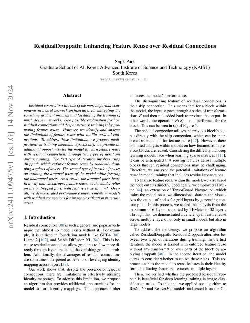 Residual connections are one of the most important components in neural network architectures for mitigating the vanishing gradient problem and facilitating the training of much deeper networks. One possible explanation for how residual connections aid deeper network training is by promoting feature reuse. However, we identify and analyze the limitations of feature reuse with vanilla residual connections. To address these limitations, we propose modifications in training methods. Specifically, we provide an additional opportunity for the model to learn feature reuse with residual connections through two types of iterations during training. The first type of iteration involves using droppath, which enforces feature reuse by randomly dropping a subset of layers. The second type of iteration focuses on training the dropped parts of the model while freezing the undropped parts. As a result, the dropped parts learn in a way that encourages feature reuse, as the model relies on the undropped parts with feature reuse in mind. Overall, we demonstrated performance improvements in models with residual connections for image classification in certain cases.