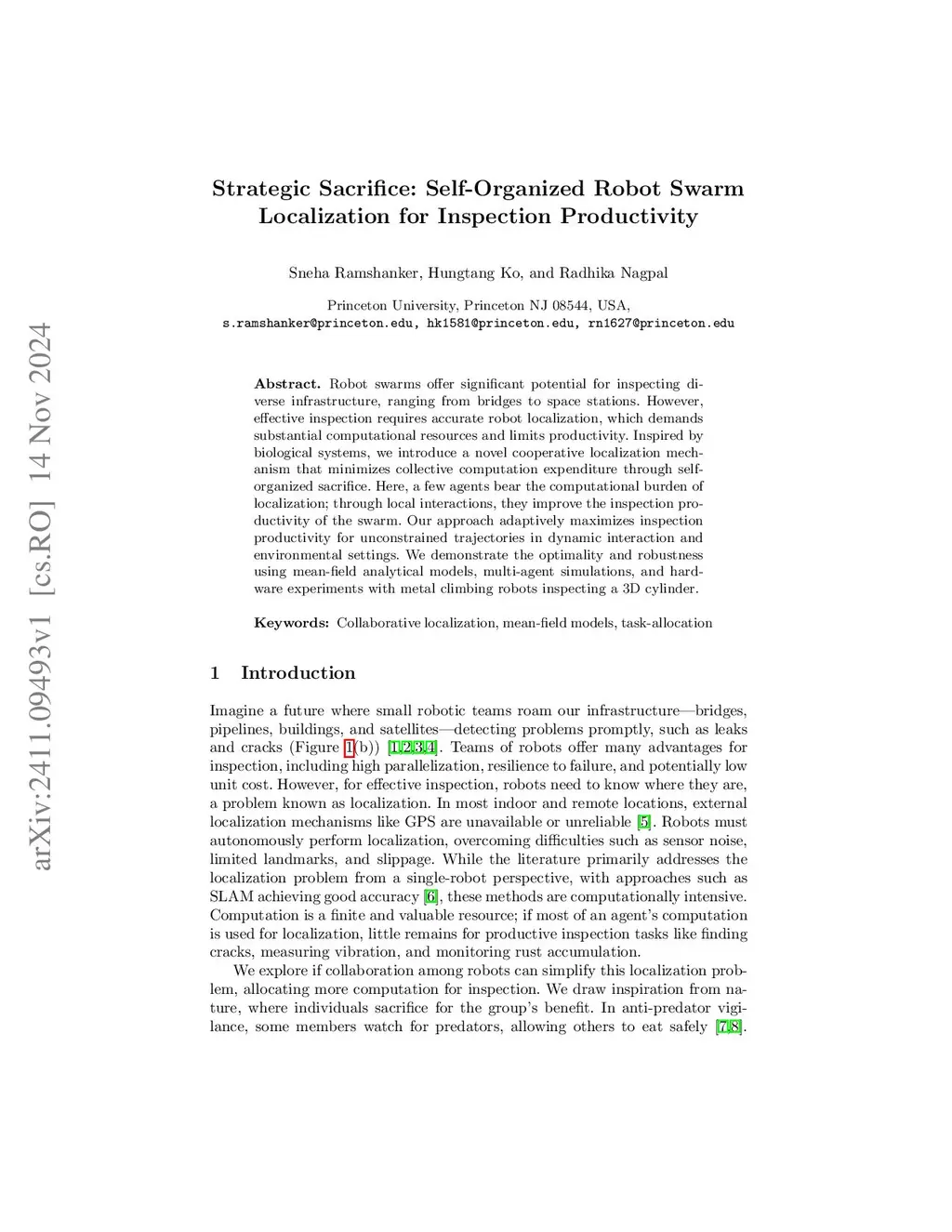 Robot swarms offer significant potential for inspecting diverse infrastructure, ranging from bridges to space stations. However, effective inspection requires accurate robot localization, which demands substantial computational resources and limits productivity. Inspired by biological systems, we introduce a novel cooperative localization mechanism that minimizes collective computation expenditure through self-organized sacrifice. Here, a few agents bear the computational burden of localization; through local interactions, they improve the inspection productivity of the swarm. Our approach adaptively maximizes inspection productivity for unconstrained trajectories in dynamic interaction and environmental settings. We demonstrate the optimality and robustness using mean-field analytical models, multi-agent simulations, and hardware experiments with metal climbing robots inspecting a 3D cylinder.