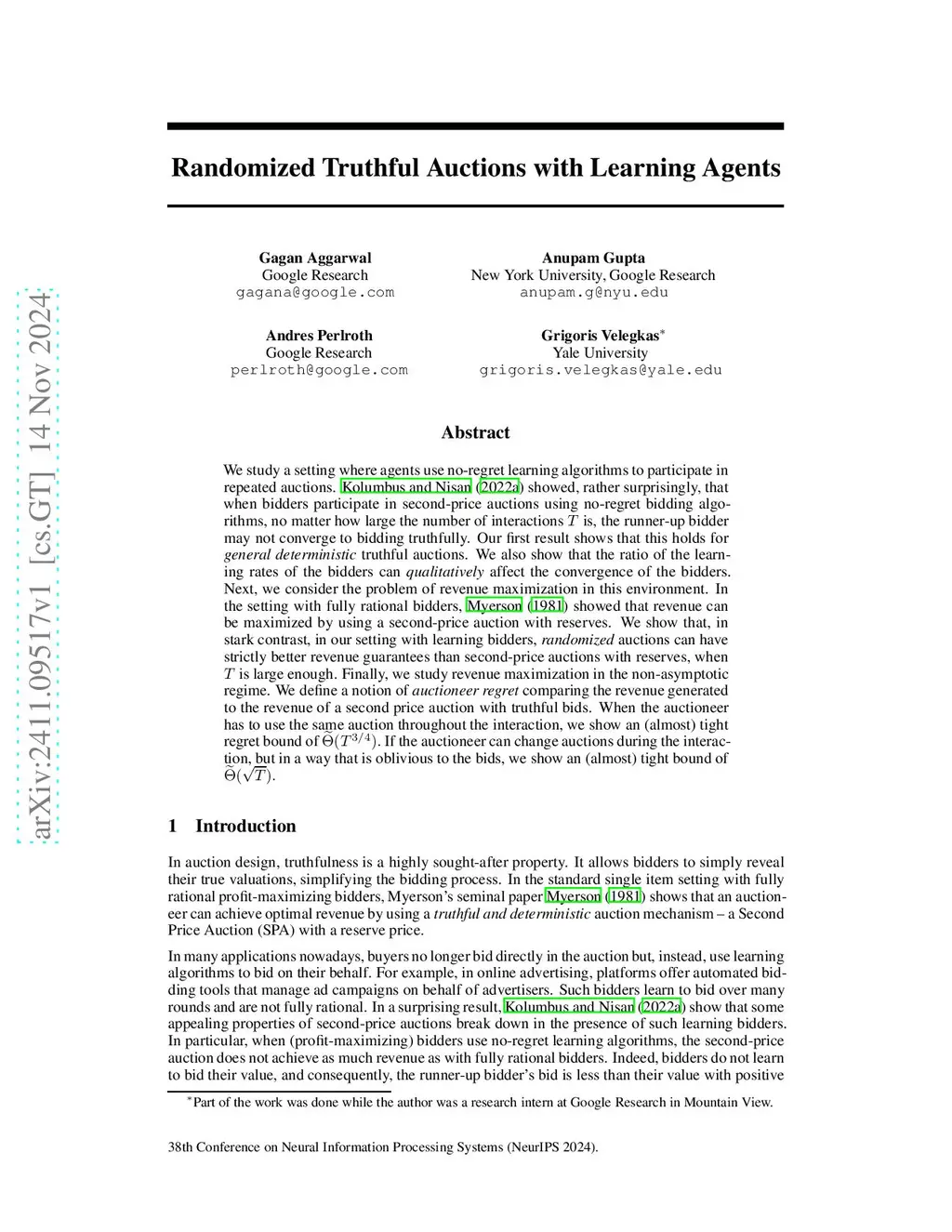 We study a setting where agents use no-regret learning algorithms to participate in repeated auctions. \citet{kolumbus2022auctions} showed, rather surprisingly, that when bidders participate in second-price auctions using no-regret bidding algorithms, no matter how large the number of interactions is, the runner-up bidder may not converge to bidding truthfully. Our first result shows that this holds for \emph{general deterministic} truthful auctions. We also show that the ratio of the learning rates of the bidders can \emph{qualitatively} affect the convergence of the bidders. Next, we consider the problem of revenue maximization in this environment. In the setting with fully rational bidders, \citet{myerson1981optimal} showed that revenue can be maximized by using a second-price auction with reserves.We show that, in stark contrast, in our setting with learning bidders, \emph{randomized} auctions can have strictly better revenue guarantees than second-price auctions with reserves, when is large enough. Finally, we study revenue maximization in the non-asymptotic regime. We define a notion of {\em auctioneer regret} comparing the revenue generated to the revenue of a second price auction with truthful bids. When the auctioneer has to use the same auction throughout the interaction, we show an (almost) tight regret bound of If the auctioneer can change auctions during the interaction, but in a way that is oblivious to the bids, we show an (almost) tight bound of