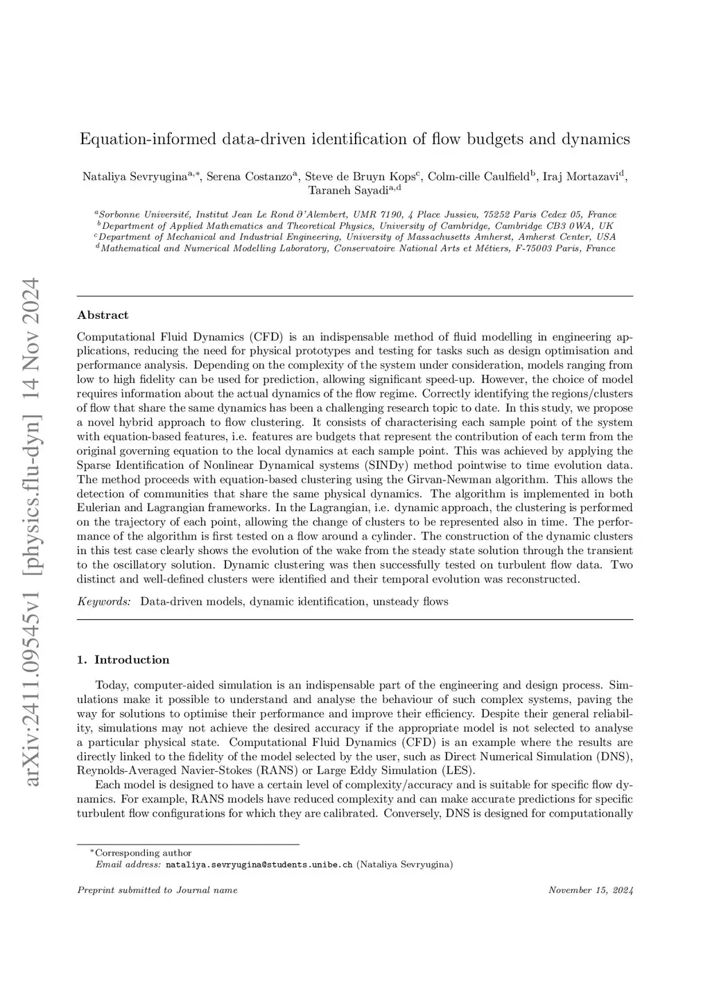 Computational Fluid Dynamics (CFD) is an indispensable method of fluid modelling in engineering applications, reducing the need for physical prototypes and testing for tasks such as design optimisation and performance analysis. Depending on the complexity of the system under consideration, models ranging from low to high fidelity can be used for prediction, allowing significant speed-up. However, the choice of model requires information about the actual dynamics of the flow regime. Correctly identifying the regions/clusters of flow that share the same dynamics has been a challenging research topic to date. In this study, we propose a novel hybrid approach to flow clustering. It consists of characterising each sample point of the system with equation-based features, i.e. features are budgets that represent the contribution of each term from the original governing equation to the local dynamics at each sample point. This was achieved by applying the Sparse Identification of Nonlinear Dynamical systems (SINDy) method pointwise to time evolution data. The method proceeds with equation-based clustering using the Girvan-Newman algorithm. This allows the detection of communities that share the same physical dynamics. The algorithm is implemented in both Eulerian and Lagrangian frameworks. In the Lagrangian, i.e. dynamic approach, the clustering is performed on the trajectory of each point, allowing the change of clusters to be represented also in time. The performance of the algorithm is first tested on a flow around a cylinder. The construction of the dynamic clusters in this test case clearly shows the evolution of the wake from the steady state solution through the transient to the oscillatory solution. Dynamic clustering was then successfully tested on turbulent flow data. Two distinct and well-defined clusters were identified and their temporal evolution was reconstructed.