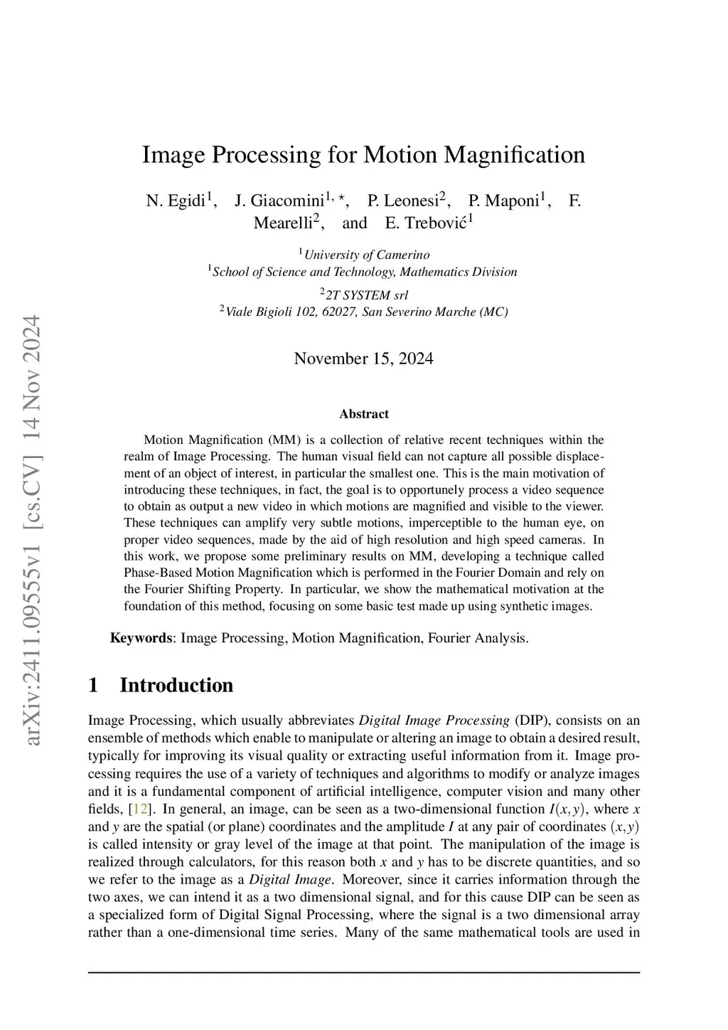Motion Magnification (MM) is a collection of relative recent techniques within the realm of Image Processing. The main motivation of introducing these techniques in to support the human visual system to capture relevant displacements of an object of interest; these motions can be in object color and in object location. In fact, the goal is to opportunely process a video sequence to obtain as output a new video in which motions are magnified and visible to the viewer. We propose a numerical technique using the Phase-Based Motion Magnification which analyses the video sequence in the Fourier Domain and rely on the Fourier Shifting Property. We describe the mathematical foundation of this method and the corresponding implementation in a numerical algorithm. We present preliminary experiments, focusing on some basic test made up using synthetic images.