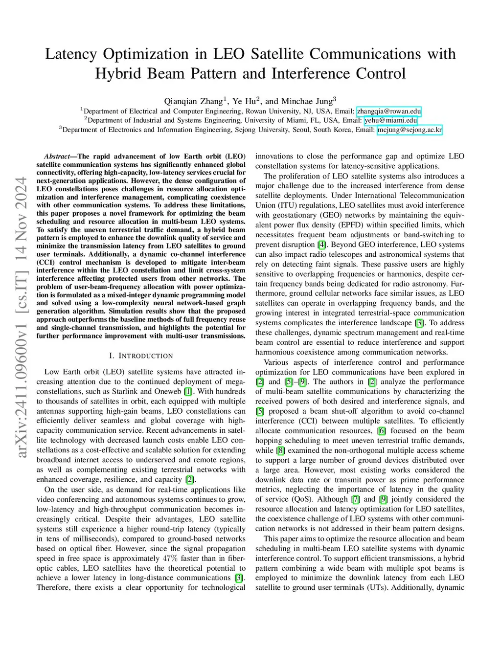 The rapid advancement of low Earth orbit (LEO) satellite communication systems has significantly enhanced global connectivity, offering high-capacity, low-latency services crucial for next-generation applications. However, the dense configuration of LEO constellations poses challenges in resource allocation optimization and interference management, complicating coexistence with other communication systems. To address these limitations, this paper proposes a novel framework for optimizing the beam scheduling and resource allocation in multi-beam LEO systems. To satisfy the uneven terrestrial traffic demand, a hybrid beam pattern is employed to enhance the downlink quality of service and minimize the transmission latency from LEO satellites to ground user terminals. Additionally, a dynamic co-channel interference (CCI) control mechanism is developed to mitigate inter-beam interference within the LEO constellation and limit cross-system interference affecting protected users from other networks. The problem of user-beam-frequency allocation with power optimization is formulated as a mixed-integer dynamic programming model and solved using a low-complexity neural network-based graph generation algorithm. Simulation results show that the proposed approach outperforms the baseline methods of full frequency reuse and single-channel transmission, and highlights the potential for further performance improvement with multi-user transmissions.
