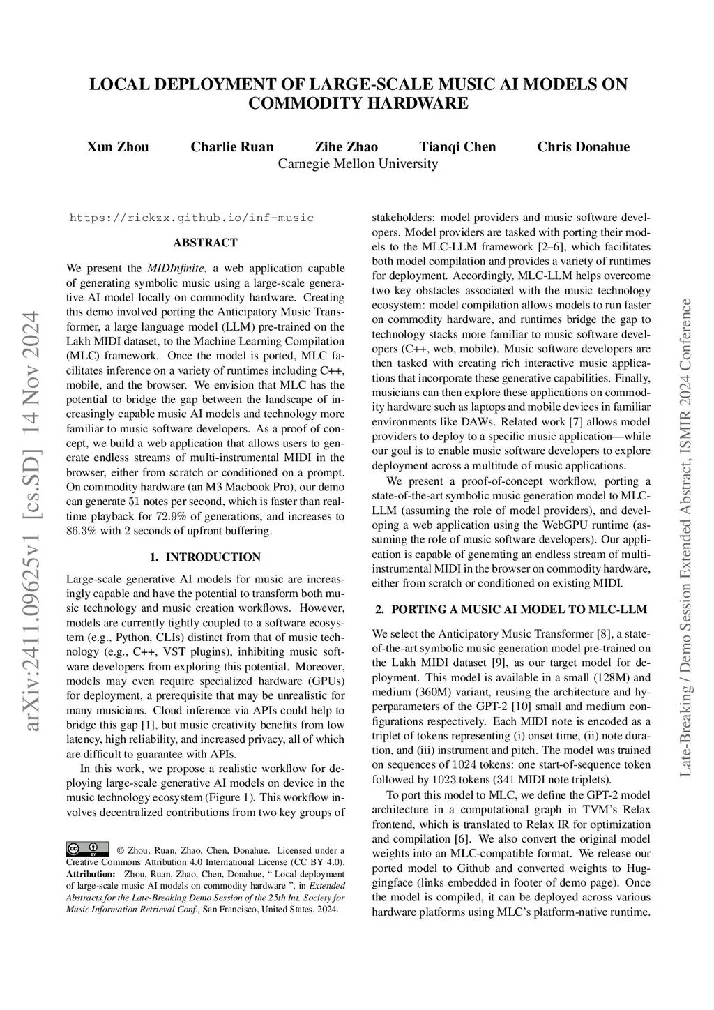 We present the MIDInfinite, a web application capable of generating symbolic music using a large-scale generative AI model locally on commodity hardware. Creating this demo involved porting the Anticipatory Music Transformer, a large language model (LLM) pre-trained on the Lakh MIDI dataset, to the Machine Learning Compilation (MLC) framework. Once the model is ported, MLC facilitates inference on a variety of runtimes including C++, mobile, and the browser. We envision that MLC has the potential to bridge the gap between the landscape of increasingly capable music AI models and technology more familiar to music software developers. As a proof of concept, we build a web application that allows users to generate endless streams of multi-instrumental MIDI in the browser, either from scratch or conditioned on a prompt. On commodity hardware (an M3 Macbook Pro), our demo can generate 51 notes per second, which is faster than real-time playback for 72.9% of generations, and increases to 86.3% with 2 seconds of upfront buffering.
