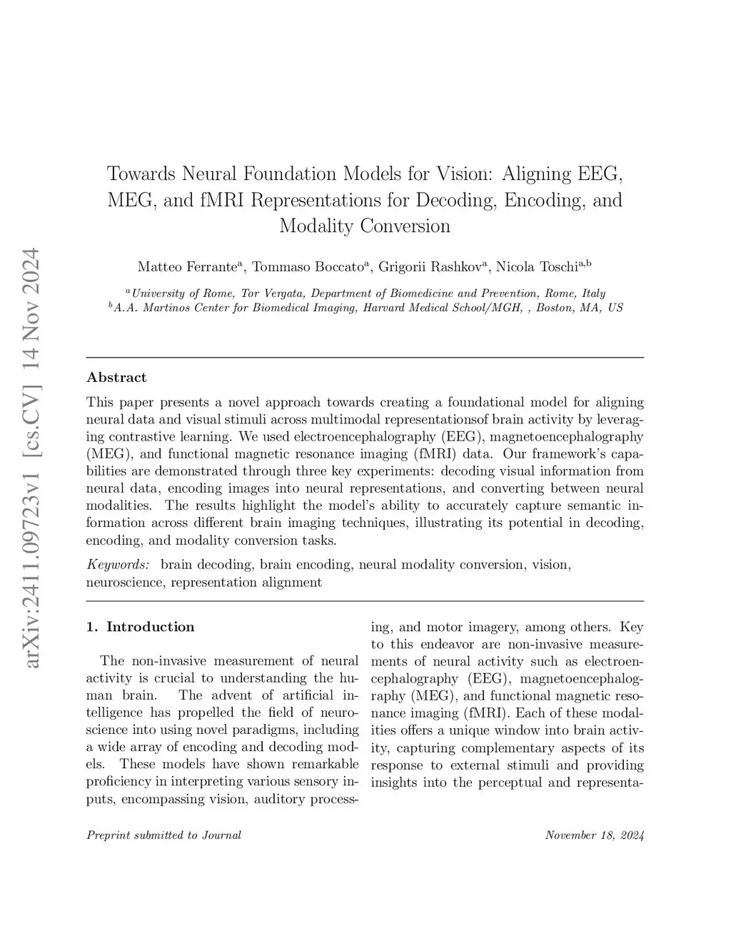 This paper presents a novel approach towards creating a foundational model for aligning neural data and visual stimuli across multimodal representationsof brain activity by leveraging contrastive learning. We used electroencephalography (EEG), magnetoencephalography (MEG), and functional magnetic resonance imaging (fMRI) data. Our framework's capabilities are demonstrated through three key experiments: decoding visual information from neural data, encoding images into neural representations, and converting between neural modalities. The results highlight the model's ability to accurately capture semantic information across different brain imaging techniques, illustrating its potential in decoding, encoding, and modality conversion tasks.