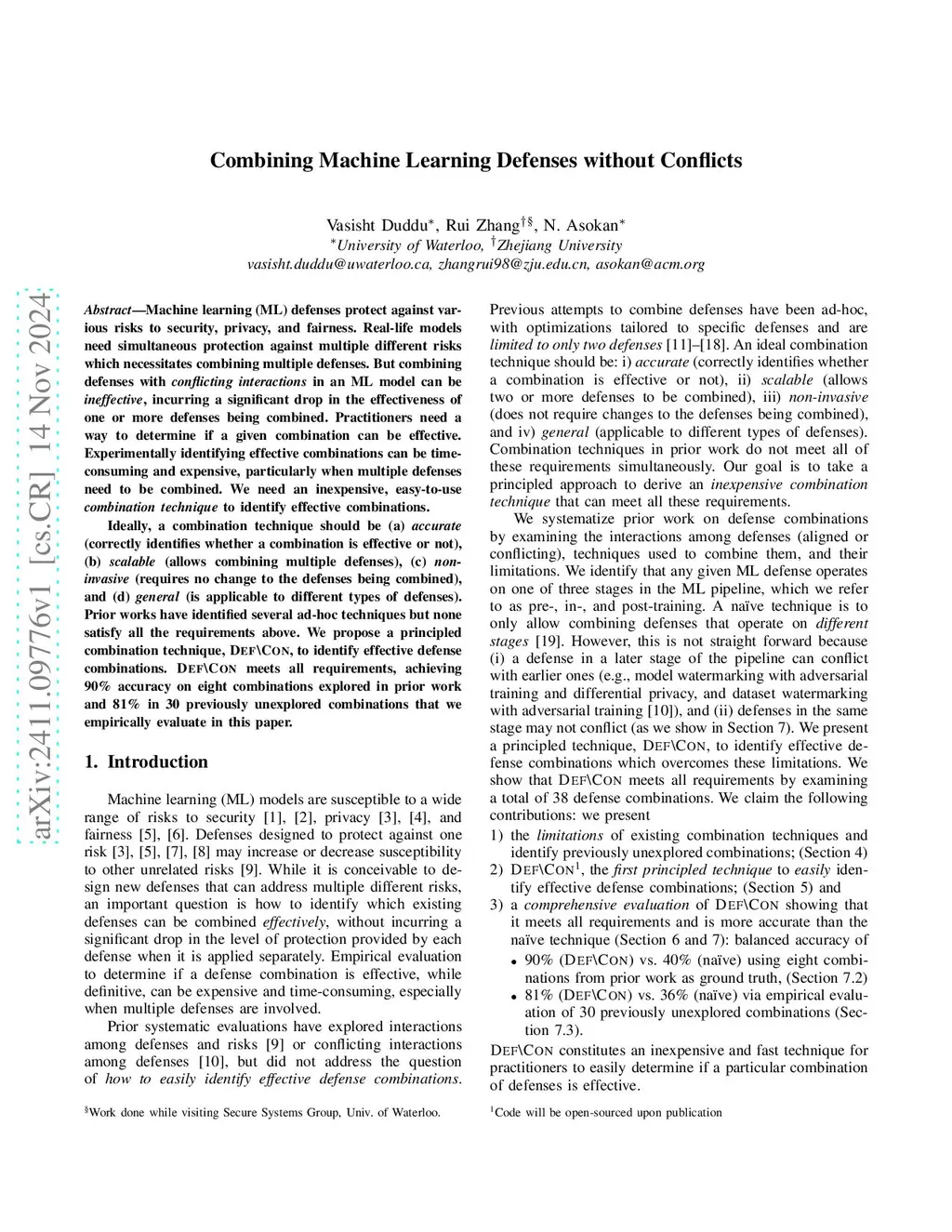 Machine learning (ML) defenses protect against various risks to security, privacy, and fairness. Real-life models need simultaneous protection against multiple different risks which necessitates combining multiple defenses. But combining defenses with conflicting interactions in an ML model can be ineffective, incurring a significant drop in the effectiveness of one or more defenses being combined. Practitioners need a way to determine if a given combination can be effective. Experimentally identifying effective combinations can be time-consuming and expensive, particularly when multiple defenses need to be combined. We need an inexpensive, easy-to-use combination technique to identify effective combinations. Ideally, a combination technique should be (a) accurate (correctly identifies whether a combination is effective or not), (b) scalable (allows combining multiple defenses), (c) non-invasive (requires no change to the defenses being combined), and (d) general (is applicable to different types of defenses). Prior works have identified several ad-hoc techniques but none satisfy all the requirements above. We propose a principled combination technique, Def\Con, to identify effective defense combinations. Def\Con meets all requirements, achieving 90% accuracy on eight combinations explored in prior work and 81% in 30 previously unexplored combinations that we empirically evaluate in this paper.