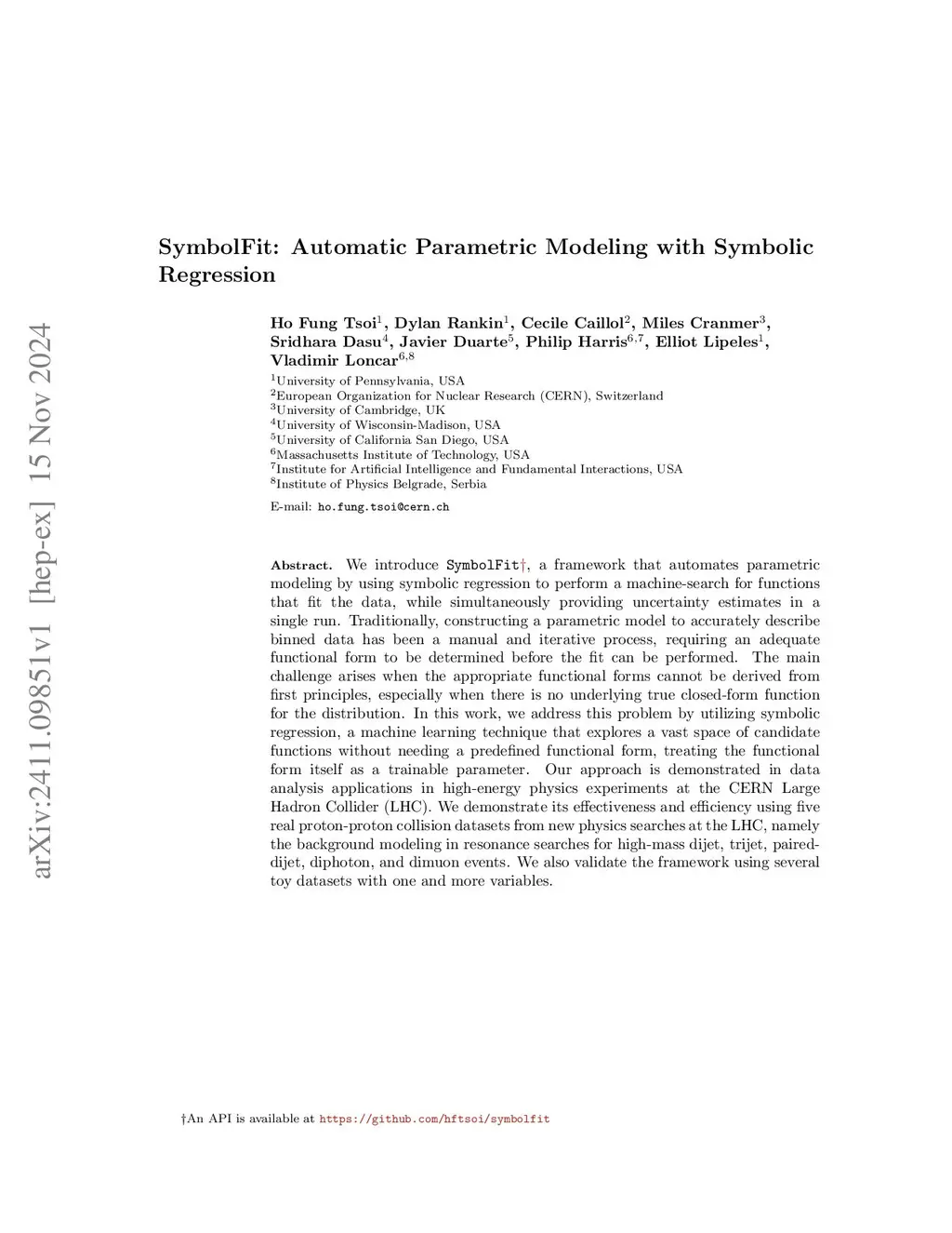 We introduce SymbolFit, a framework that automates parametric modeling by using symbolic regression to perform a machine-search for functions that fit the data while simultaneously providing uncertainty estimates in a single run. Traditionally, constructing a parametric model to accurately describe binned data has been a manual and iterative process, requiring an adequate functional form to be determined before the fit can be performed. The main challenge arises when the appropriate functional forms cannot be derived from first principles, especially when there is no underlying true closed-form function for the distribution. In this work, we develop a framework that automates and streamlines the process by utilizing symbolic regression, a machine learning technique that explores a vast space of candidate functions without requiring a predefined functional form because the functional form itself is treated as a trainable parameter, making the process far more efficient and effortless than traditional regression methods. We demonstrate the framework in high-energy physics experiments at the CERN Large Hadron Collider (LHC) using five real proton-proton collision datasets from new physics searches, including background modeling in resonance searches for high-mass dijet, trijet, paired-dijet, diphoton, and dimuon events. We show that our framework can flexibly and efficiently generate a wide range of candidate functions that fit a nontrivial distribution well using a simple fit configuration that varies only by random seed, and that the same fit configuration, which defines a vast function space, can also be applied to distributions of different shapes, whereas achieving a comparable result with traditional methods would have required extensive manual effort.