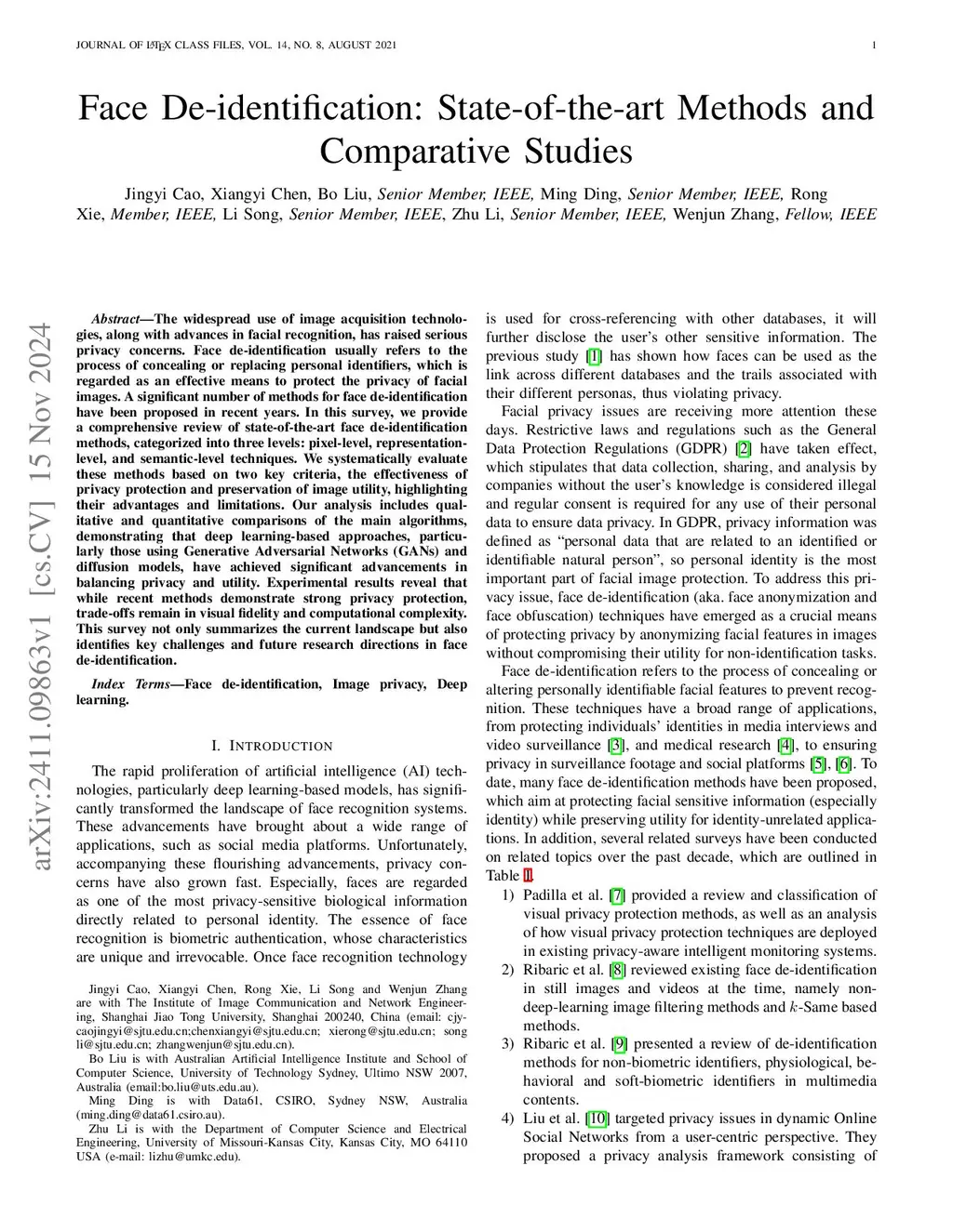 Face De-identification: State-of-the-art Methods and Comparative Studies