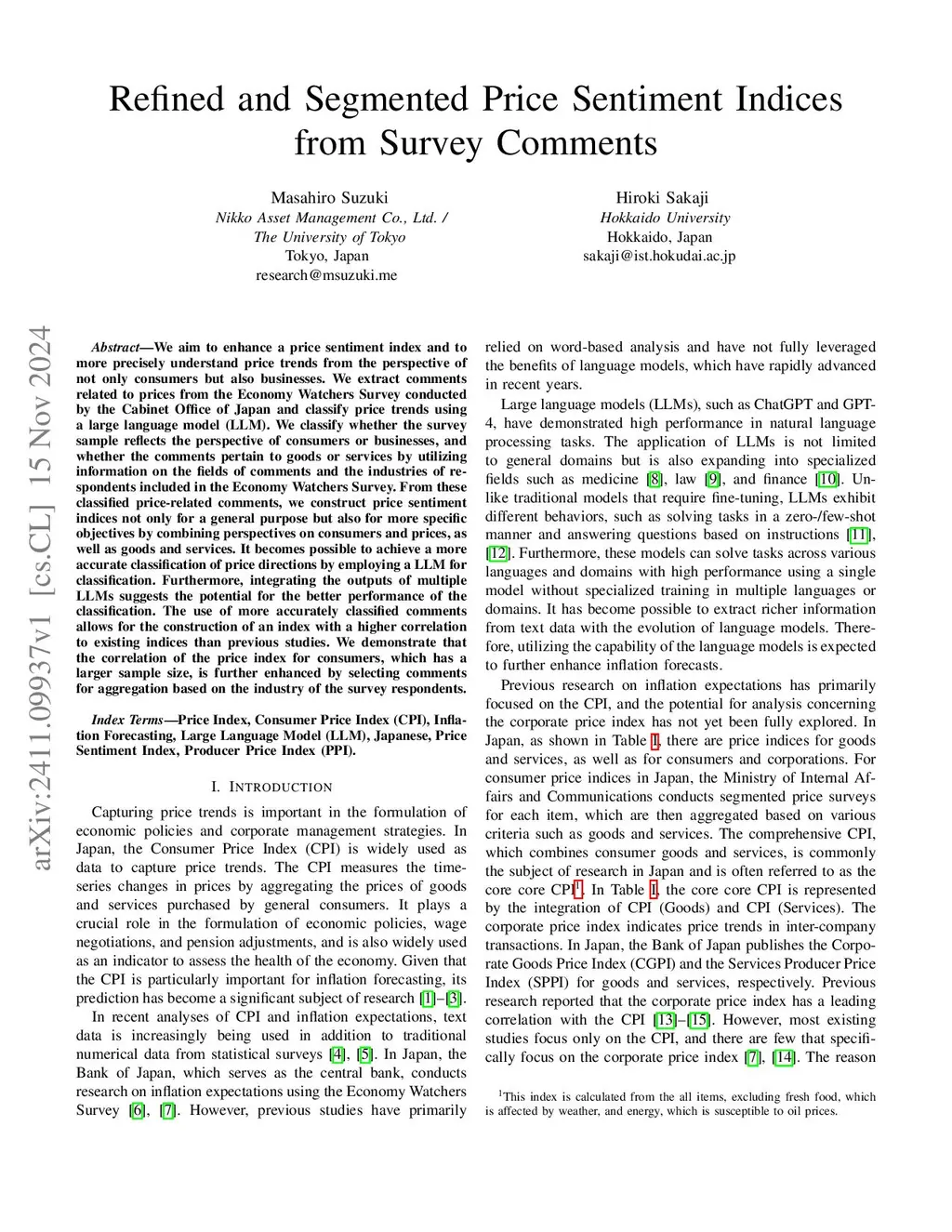 We aim to enhance a price sentiment index and to more precisely understand price trends from the perspective of not only consumers but also businesses. We extract comments related to prices from the Economy Watchers Survey conducted by the Cabinet Office of Japan and classify price trends using a large language model (LLM). We classify whether the survey sample reflects the perspective of consumers or businesses, and whether the comments pertain to goods or services by utilizing information on the fields of comments and the industries of respondents included in the Economy Watchers Survey. From these classified price-related comments, we construct price sentiment indices not only for a general purpose but also for more specific objectives by combining perspectives on consumers and prices, as well as goods and services. It becomes possible to achieve a more accurate classification of price directions by employing a LLM for classification. Furthermore, integrating the outputs of multiple LLMs suggests the potential for the better performance of the classification. The use of more accurately classified comments allows for the construction of an index with a higher correlation to existing indices than previous studies. We demonstrate that the correlation of the price index for consumers, which has a larger sample size, is further enhanced by selecting comments for aggregation based on the industry of the survey respondents.