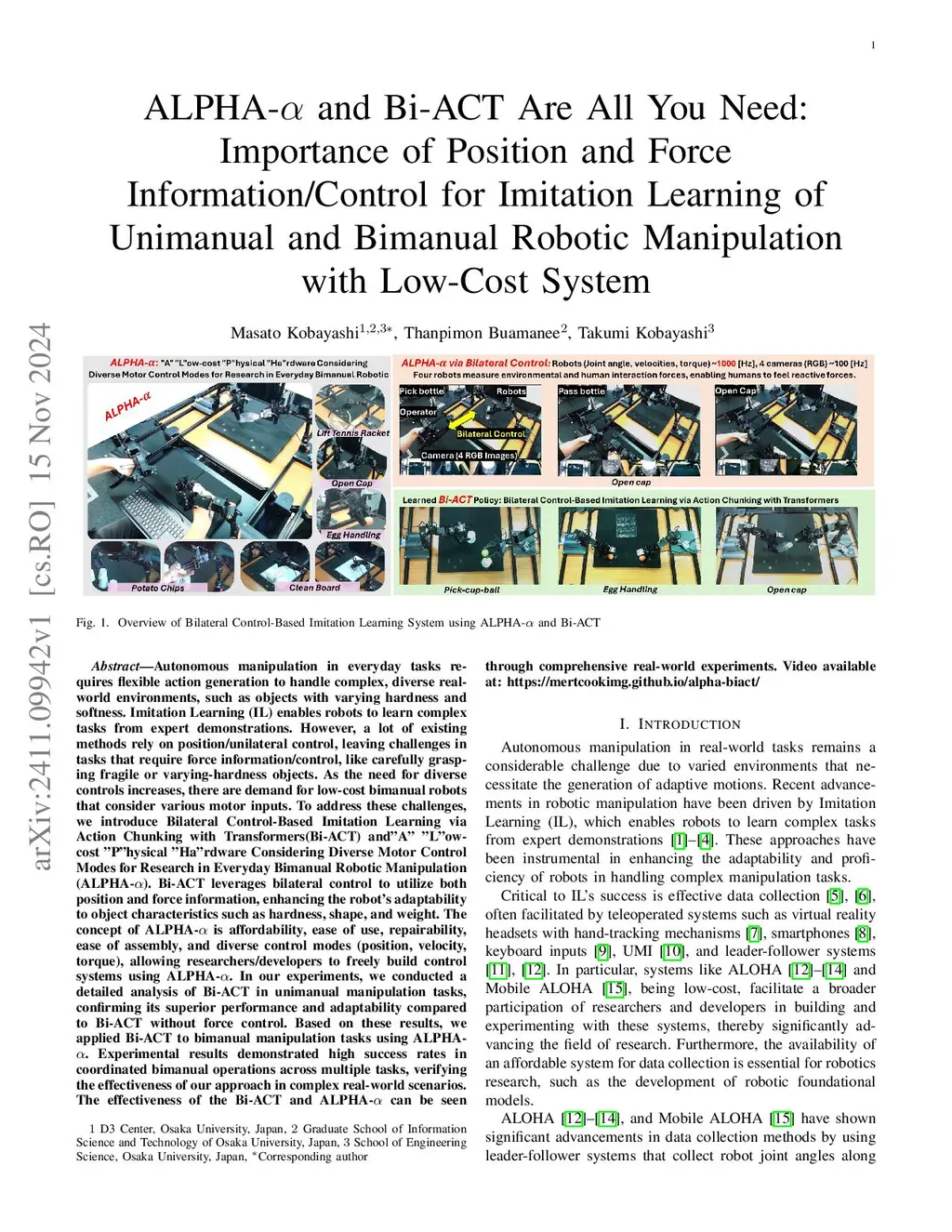 Autonomous manipulation in everyday tasks requires flexible action generation to handle complex, diverse real-world environments, such as objects with varying hardness and softness. Imitation Learning (IL) enables robots to learn complex tasks from expert demonstrations. However, a lot of existing methods rely on position/unilateral control, leaving challenges in tasks that require force information/control, like carefully grasping fragile or varying-hardness objects. As the need for diverse controls increases, there are demand for low-cost bimanual robots that consider various motor inputs. To address these challenges, we introduce Bilateral Control-Based Imitation Learning via Action Chunking with Transformers(Bi-ACT) and"A" "L"ow-cost "P"hysical "Ha"rdware Considering Diverse Motor Control Modes for Research in Everyday Bimanual Robotic Manipulation (ALPHA-). Bi-ACT leverages bilateral control to utilize both position and force information, enhancing the robot's adaptability to object characteristics such as hardness, shape, and weight. The concept of ALPHA- is affordability, ease of use, repairability, ease of assembly, and diverse control modes (position, velocity, torque), allowing researchers/developers to freely build control systems using ALPHA-. In our experiments, we conducted a detailed analysis of Bi-ACT in unimanual manipulation tasks, confirming its superior performance and adaptability compared to Bi-ACT without force control. Based on these results, we applied Bi-ACT to bimanual manipulation tasks. Experimental results demonstrated high success rates in coordinated bimanual operations across multiple tasks. The effectiveness of the Bi-ACT and ALPHA- can be seen through comprehensive real-world experiments. Video available at: https://mertcookimg.github.io/alpha-biact/