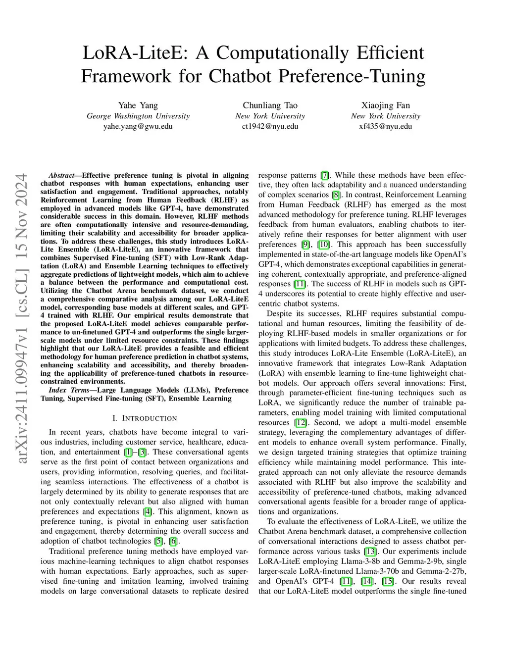 Effective preference tuning is pivotal in aligning chatbot responses with human expectations, enhancing user satisfaction and engagement. Traditional approaches, notably Reinforcement Learning from Human Feedback (RLHF) as employed in advanced models like GPT-4, have demonstrated considerable success in this domain. However, RLHF methods are often computationally intensive and resource-demanding, limiting their scalability and accessibility for broader applications. To address these challenges, this study introduces LoRA-Lite Ensemble (LoRA-LiteE), an innovative framework that combines Supervised Fine-tuning (SFT) with Low-Rank Adaptation (LoRA) and Ensemble Learning techniques to effectively aggregate predictions of lightweight models, which aim to achieve a balance between the performance and computational cost. Utilizing the Chatbot Arena benchmark dataset, we conduct a comprehensive comparative analysis among our LoRA-LiteE model, corresponding base models at different scales, and GPT-4 trained with RLHF. Our empirical results demonstrate that the proposed LoRA-LiteE model achieves comparable performance to un-finetuned GPT-4 and outperforms the single larger-scale models under limited resource constraints. These findings highlight that our LoRA-LiteE provides a feasible and efficient methodology for human preference prediction in chatbot systems, enhancing scalability and accessibility, and thereby broadening the applicability of preference-tuned chatbots in resource-constrained environments.