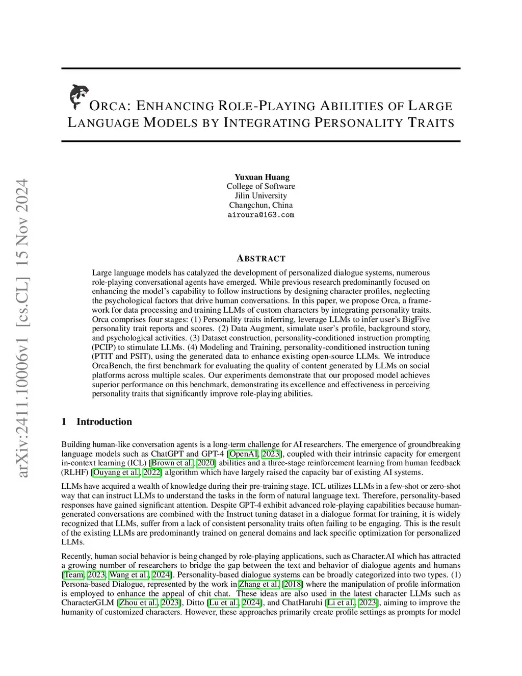 Large language models has catalyzed the development of personalized dialogue systems, numerous role-playing conversational agents have emerged. While previous research predominantly focused on enhancing the model's capability to follow instructions by designing character profiles, neglecting the psychological factors that drive human conversations. In this paper, we propose Orca, a framework for data processing and training LLMs of custom characters by integrating personality traits. Orca comprises four stages: (1) Personality traits inferring, leverage LLMs to infer user's BigFive personality trait reports and scores. (2) Data Augment, simulate user's profile, background story, and psychological activities. (3) Dataset construction, personality-conditioned instruction prompting (PCIP) to stimulate LLMs. (4) Modeling and Training, personality-conditioned instruction tuning (PTIT and PSIT), using the generated data to enhance existing open-source LLMs. We introduce OrcaBench, the first benchmark for evaluating the quality of content generated by LLMs on social platforms across multiple scales. Our experiments demonstrate that our proposed model achieves superior performance on this benchmark, demonstrating its excellence and effectiveness in perceiving personality traits that significantly improve role-playing abilities. Our Code is available at https://github.com/Aipura/Orca.