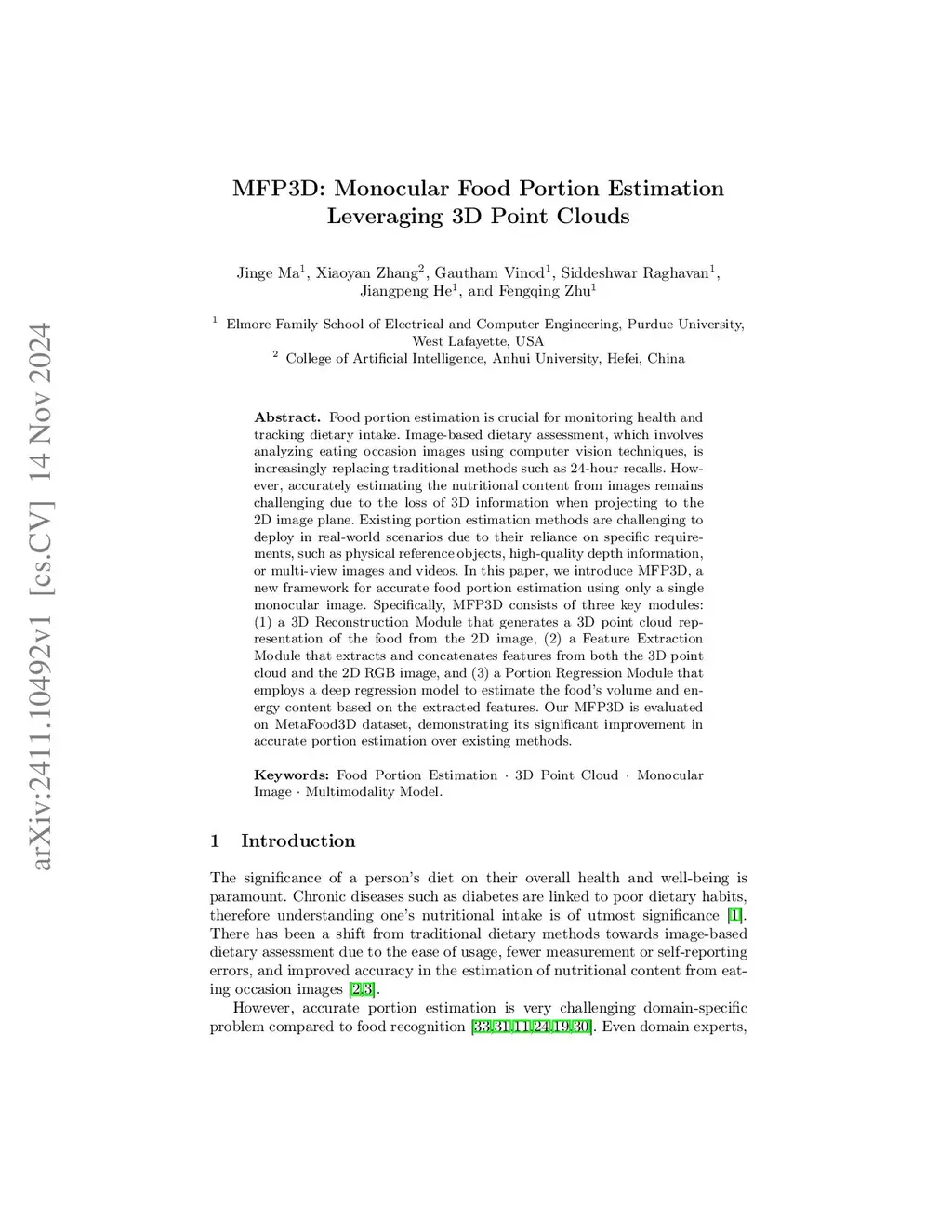 MFP3D: Monocular Food Portion Estimation Leveraging 3D Point Clouds