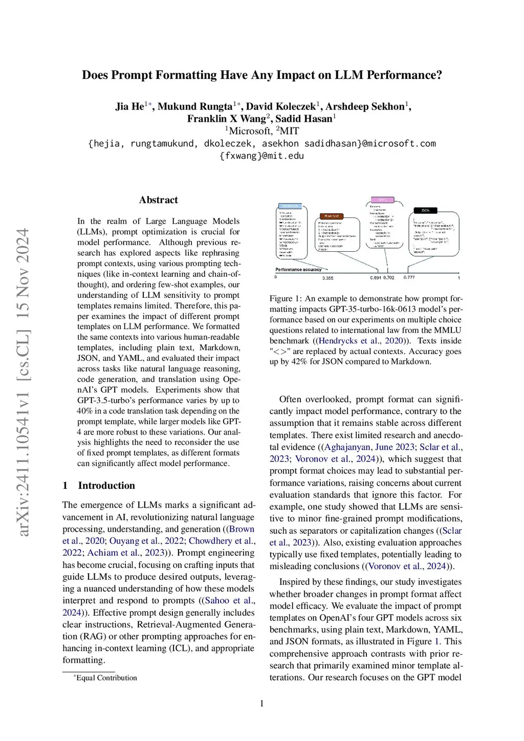 In the realm of Large Language Models (LLMs), prompt optimization is crucial for model performance. Although previous research has explored aspects like rephrasing prompt contexts, using various prompting techniques (like in-context learning and chain-of-thought), and ordering few-shot examples, our understanding of LLM sensitivity to prompt templates remains limited. Therefore, this paper examines the impact of different prompt templates on LLM performance. We formatted the same contexts into various human-readable templates, including plain text, Markdown, JSON, and YAML, and evaluated their impact across tasks like natural language reasoning, code generation, and translation using OpenAI's GPT models. Experiments show that GPT-3.5-turbo's performance varies by up to 40\% in a code translation task depending on the prompt template, while larger models like GPT-4 are more robust to these variations. Our analysis highlights the need to reconsider the use of fixed prompt templates, as different formats can significantly affect model performance.