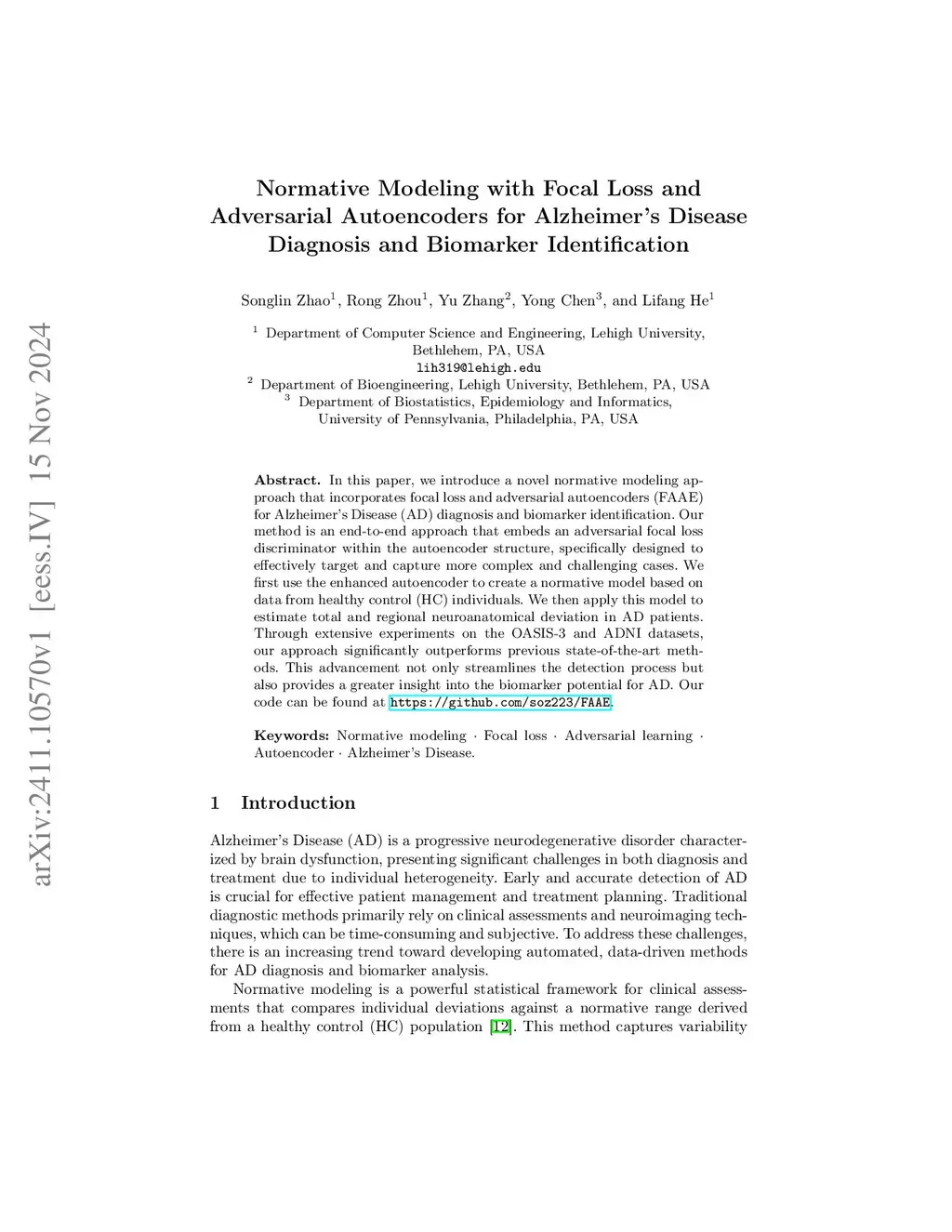 In this paper, we introduce a novel normative modeling approach that incorporates focal loss and adversarial autoencoders (FAAE) for Alzheimer's Disease (AD) diagnosis and biomarker identification. Our method is an end-to-end approach that embeds an adversarial focal loss discriminator within the autoencoder structure, specifically designed to effectively target and capture more complex and challenging cases. We first use the enhanced autoencoder to create a normative model based on data from healthy control (HC) individuals. We then apply this model to estimate total and regional neuroanatomical deviation in AD patients. Through extensive experiments on the OASIS-3 and ADNI datasets, our approach significantly outperforms previous state-of-the-art methods. This advancement not only streamlines the detection process but also provides a greater insight into the biomarker potential for AD. Our code can be found at \url{https://github.com/soz223/FAAE}.