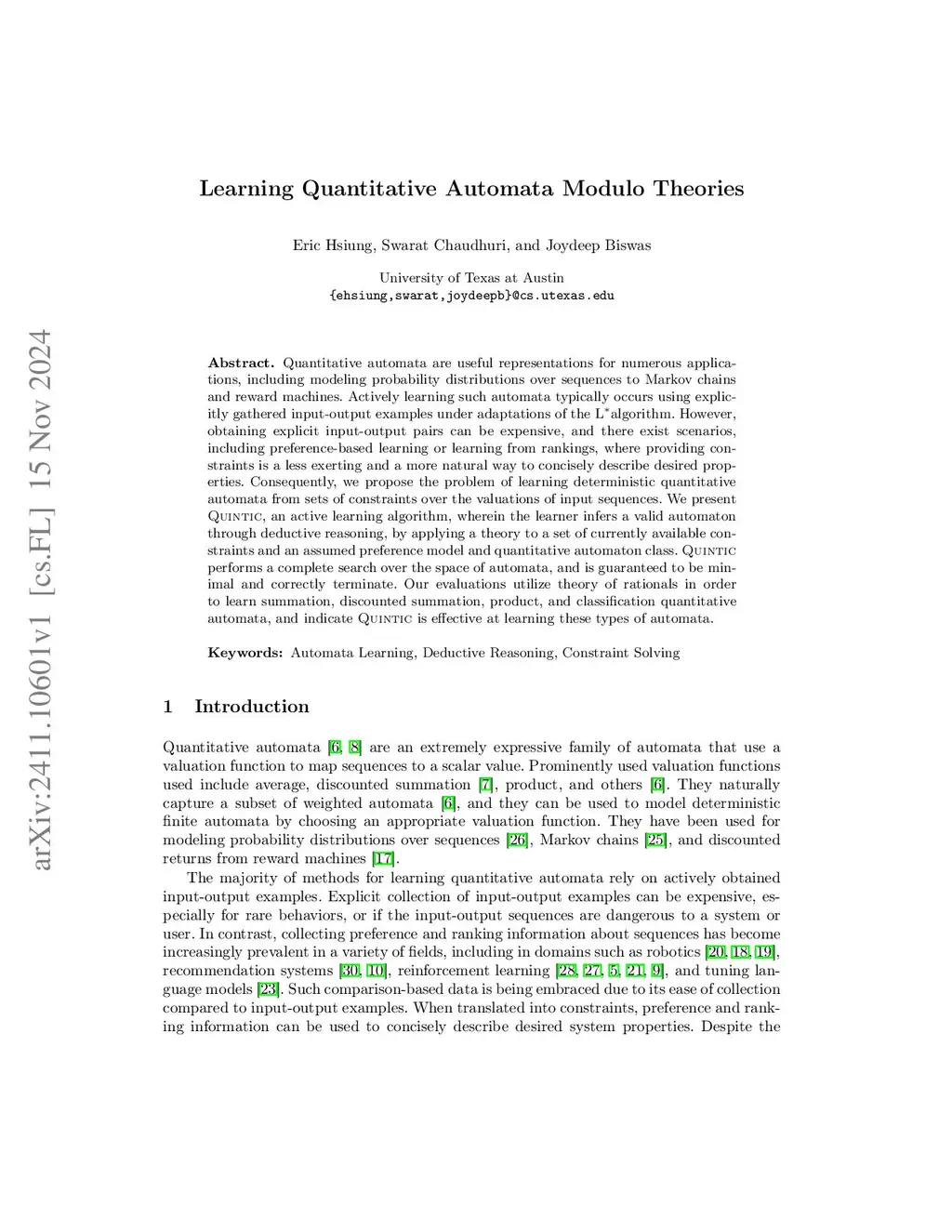 Quantitative automata are useful representations for numerous applications, including modeling probability distributions over sequences to Markov chains and reward machines. Actively learning such automata typically occurs using explicitly gathered input-output examples under adaptations of the L-star algorithm. However, obtaining explicit input-output pairs can be expensive, and there exist scenarios, including preference-based learning or learning from rankings, where providing constraints is a less exerting and a more natural way to concisely describe desired properties. Consequently, we propose the problem of learning deterministic quantitative automata from sets of constraints over the valuations of input sequences. We present QUINTIC, an active learning algorithm, wherein the learner infers a valid automaton through deductive reasoning, by applying a theory to a set of currently available constraints and an assumed preference model and quantitative automaton class. QUINTIC performs a complete search over the space of automata, and is guaranteed to be minimal and correctly terminate. Our evaluations utilize theory of rationals in order to learn summation, discounted summation, product, and classification quantitative automata, and indicate QUINTIC is effective at learning these types of automata.