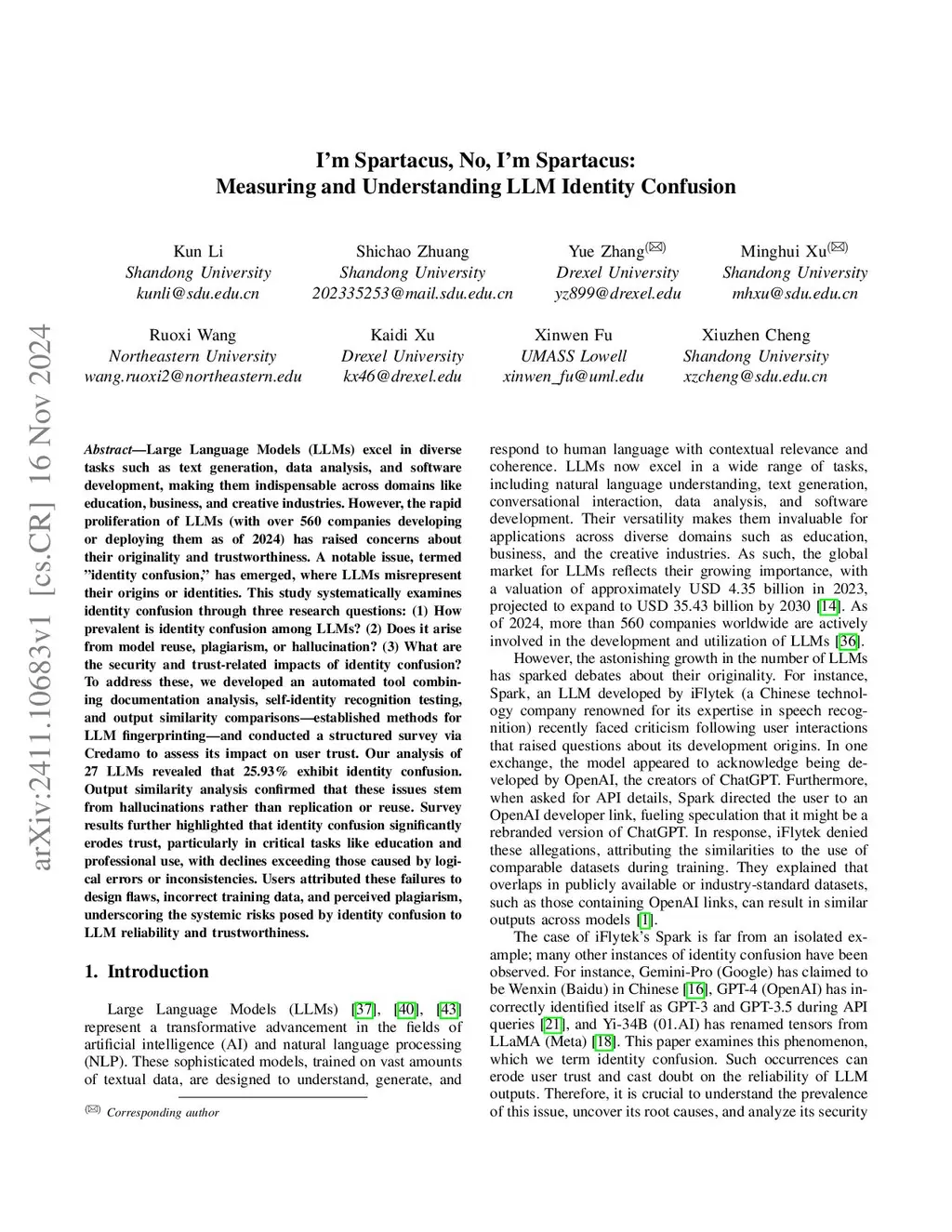 Large Language Models (LLMs) excel in diverse tasks such as text generation, data analysis, and software development, making them indispensable across domains like education, business, and creative industries. However, the rapid proliferation of LLMs (with over 560 companies developing or deploying them as of 2024) has raised concerns about their originality and trustworthiness. A notable issue, termed identity confusion, has emerged, where LLMs misrepresent their origins or identities. This study systematically examines identity confusion through three research questions: (1) How prevalent is identity confusion among LLMs? (2) Does it arise from model reuse, plagiarism, or hallucination? (3) What are the security and trust-related impacts of identity confusion? To address these, we developed an automated tool combining documentation analysis, self-identity recognition testing, and output similarity comparisons--established methods for LLM fingerprinting--and conducted a structured survey via Credamo to assess its impact on user trust. Our analysis of 27 LLMs revealed that 25.93% exhibit identity confusion. Output similarity analysis confirmed that these issues stem from hallucinations rather than replication or reuse. Survey results further highlighted that identity confusion significantly erodes trust, particularly in critical tasks like education and professional use, with declines exceeding those caused by logical errors or inconsistencies. Users attributed these failures to design flaws, incorrect training data, and perceived plagiarism, underscoring the systemic risks posed by identity confusion to LLM reliability and trustworthiness.