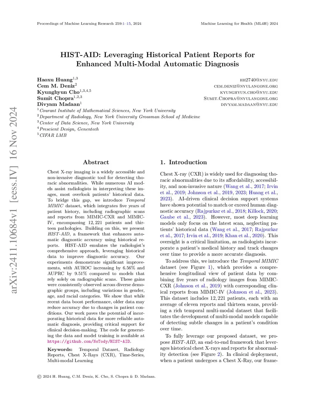 Chest X-ray imaging is a widely accessible and non-invasive diagnostic tool for detecting thoracic abnormalities. While numerous AI models assist radiologists in interpreting these images, most overlook patients' historical data. To bridge this gap, we introduce Temporal MIMIC dataset, which integrates five years of patient history, including radiographic scans and reports from MIMIC-CXR and MIMIC-IV, encompassing 12,221 patients and thirteen pathologies. Building on this, we present HIST-AID, a framework that enhances automatic diagnostic accuracy using historical reports. HIST-AID emulates the radiologist's comprehensive approach, leveraging historical data to improve diagnostic accuracy. Our experiments demonstrate significant improvements, with AUROC increasing by 6.56% and AUPRC by 9.51% compared to models that rely solely on radiographic scans. These gains were consistently observed across diverse demographic groups, including variations in gender, age, and racial categories. We show that while recent data boost performance, older data may reduce accuracy due to changes in patient conditions. Our work paves the potential of incorporating historical data for more reliable automatic diagnosis, providing critical support for clinical decision-making.