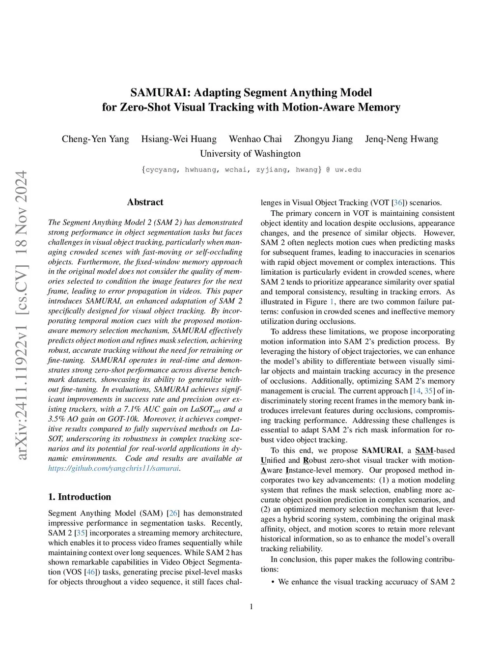SAMURAI: Adapting Segment Anything Model for Zero-Shot Visual Tracking