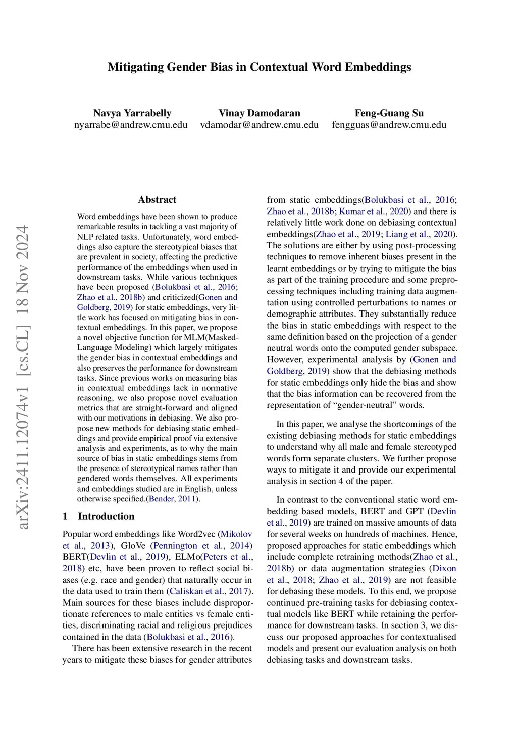 Word embeddings have been shown to produce remarkable results in tackling a vast majority of NLP related tasks. Unfortunately, word embeddings also capture the stereotypical biases that are prevalent in society, affecting the predictive performance of the embeddings when used in downstream tasks. While various techniques have been proposed \cite{bolukbasi2016man, zhao2018learning} and criticized\cite{gonen2019lipstick} for static embeddings, very little work has focused on mitigating bias in contextual embeddings. In this paper, we propose a novel objective function for MLM(Masked-Language Modeling) which largely mitigates the gender bias in contextual embeddings and also preserves the performance for downstream tasks. Since previous works on measuring bias in contextual embeddings lack in normative reasoning, we also propose novel evaluation metrics that are straight-forward and aligned with our motivations in debiasing. We also propose new methods for debiasing static embeddings and provide empirical proof via extensive analysis and experiments, as to why the main source of bias in static embeddings stems from the presence of stereotypical names rather than gendered words themselves. All experiments and embeddings studied are in English, unless otherwise specified.\citep{bender2011achieving}.