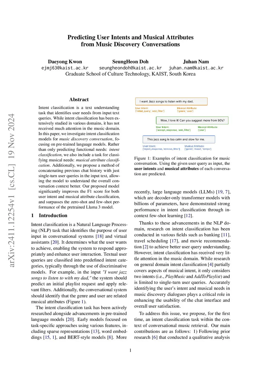 Intent classification is a text understanding task that identifies user needs from input text queries. While intent classification has been extensively studied in various domains, it has not received much attention in the music domain. In this paper, we investigate intent classification models for music discovery conversation, focusing on pre-trained language models. Rather than only predicting functional needs: intent classification, we also include a task for classifying musical needs: musical attribute classification. Additionally, we propose a method of concatenating previous chat history with just single-turn user queries in the input text, allowing the model to understand the overall conversation context better. Our proposed model significantly improves the F1 score for both user intent and musical attribute classification, and surpasses the zero-shot and few-shot performance of the pretrained Llama 3 model.