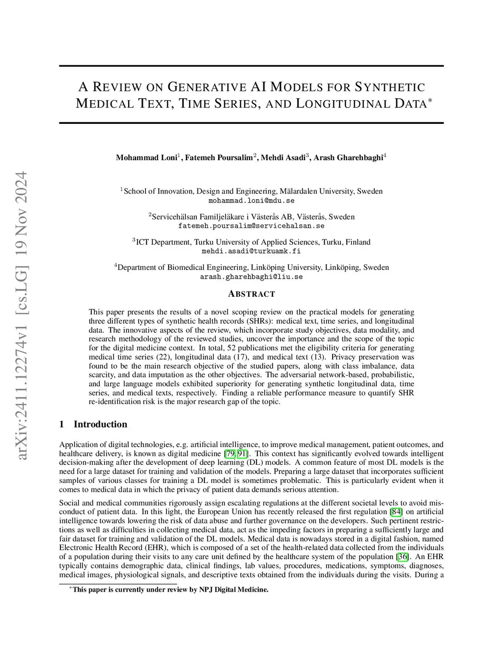 A Review on Generative AI Models for Synthetic Medical Text, Time