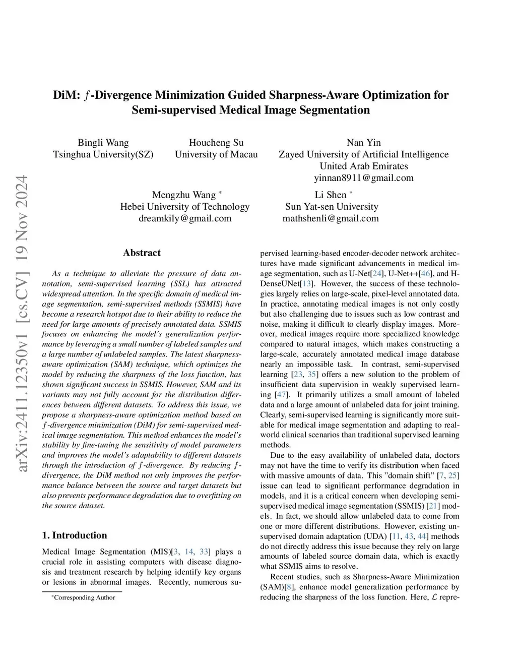 As a technique to alleviate the pressure of data annotation, semi-supervised learning (SSL) has attracted widespread attention. In the specific domain of medical image segmentation, semi-supervised methods (SSMIS) have become a research hotspot due to their ability to reduce the need for large amounts of precisely annotated data. SSMIS focuses on enhancing the model's generalization performance by leveraging a small number of labeled samples and a large number of unlabeled samples. The latest sharpness-aware optimization (SAM) technique, which optimizes the model by reducing the sharpness of the loss function, has shown significant success in SSMIS. However, SAM and its variants may not fully account for the distribution differences between different datasets. To address this issue, we propose a sharpness-aware optimization method based on -divergence minimization (DiM) for semi-supervised medical image segmentation. This method enhances the model's stability by fine-tuning the sensitivity of model parameters and improves the model's adaptability to different datasets through the introduction of -divergence. By reducing -divergence, the DiM method not only improves the performance balance between the source and target datasets but also prevents performance degradation due to overfitting on the source dataset.