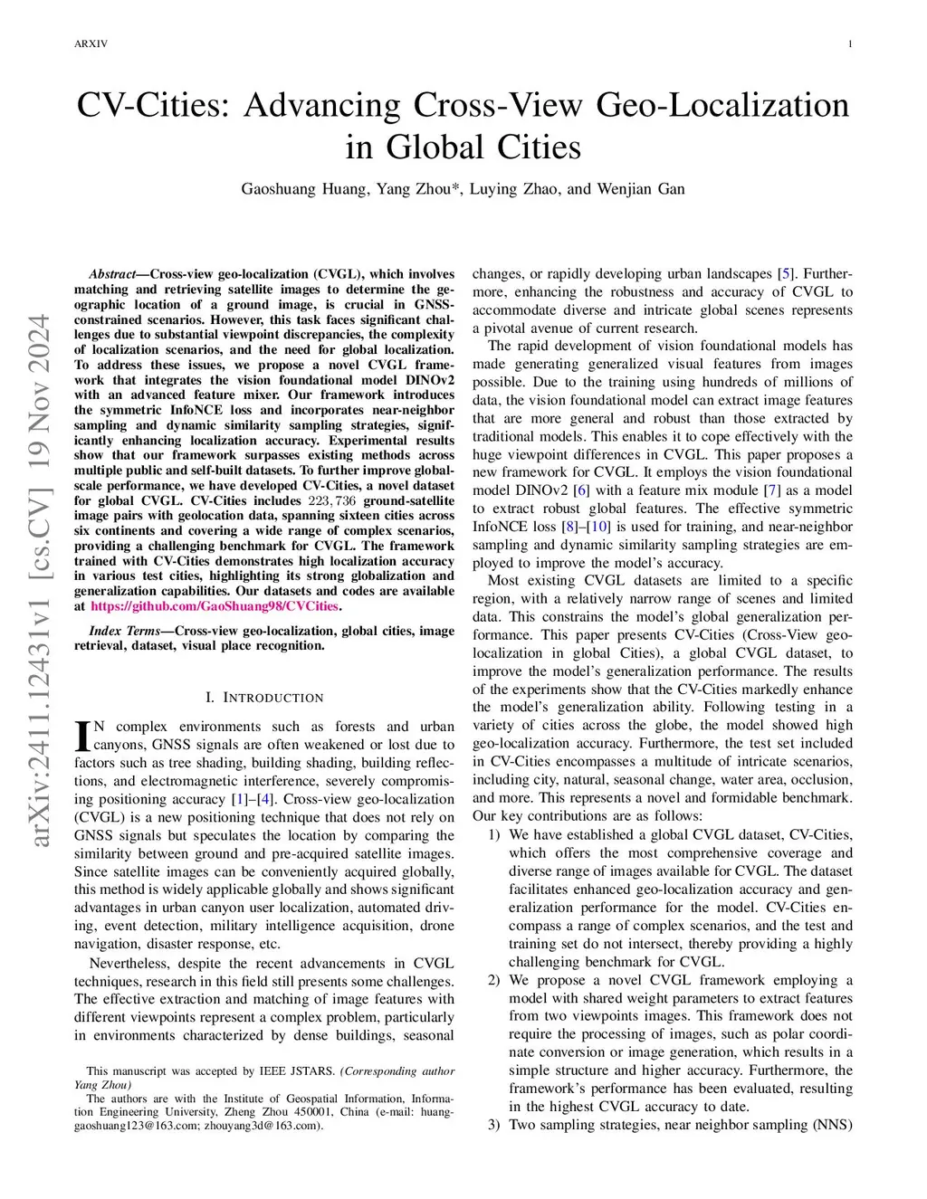 Cross-view geo-localization (CVGL), which involves matching and retrieving satellite images to determine the geographic location of a ground image, is crucial in GNSS-constrained scenarios. However, this task faces significant challenges due to substantial viewpoint discrepancies, the complexity of localization scenarios, and the need for global localization. To address these issues, we propose a novel CVGL framework that integrates the vision foundational model DINOv2 with an advanced feature mixer. Our framework introduces the symmetric InfoNCE loss and incorporates near-neighbor sampling and dynamic similarity sampling strategies, significantly enhancing localization accuracy. Experimental results show that our framework surpasses existing methods across multiple public and self-built datasets. To further improve globalscale performance, we have developed CV-Cities, a novel dataset for global CVGL. CV-Cities includes 223,736 ground-satellite image pairs with geolocation data, spanning sixteen cities across six continents and covering a wide range of complex scenarios, providing a challenging benchmark for CVGL. The framework trained with CV-Cities demonstrates high localization accuracy in various test cities, highlighting its strong globalization and generalization capabilities. Our datasets and codes are available at https://github.com/GaoShuang98/CVCities.