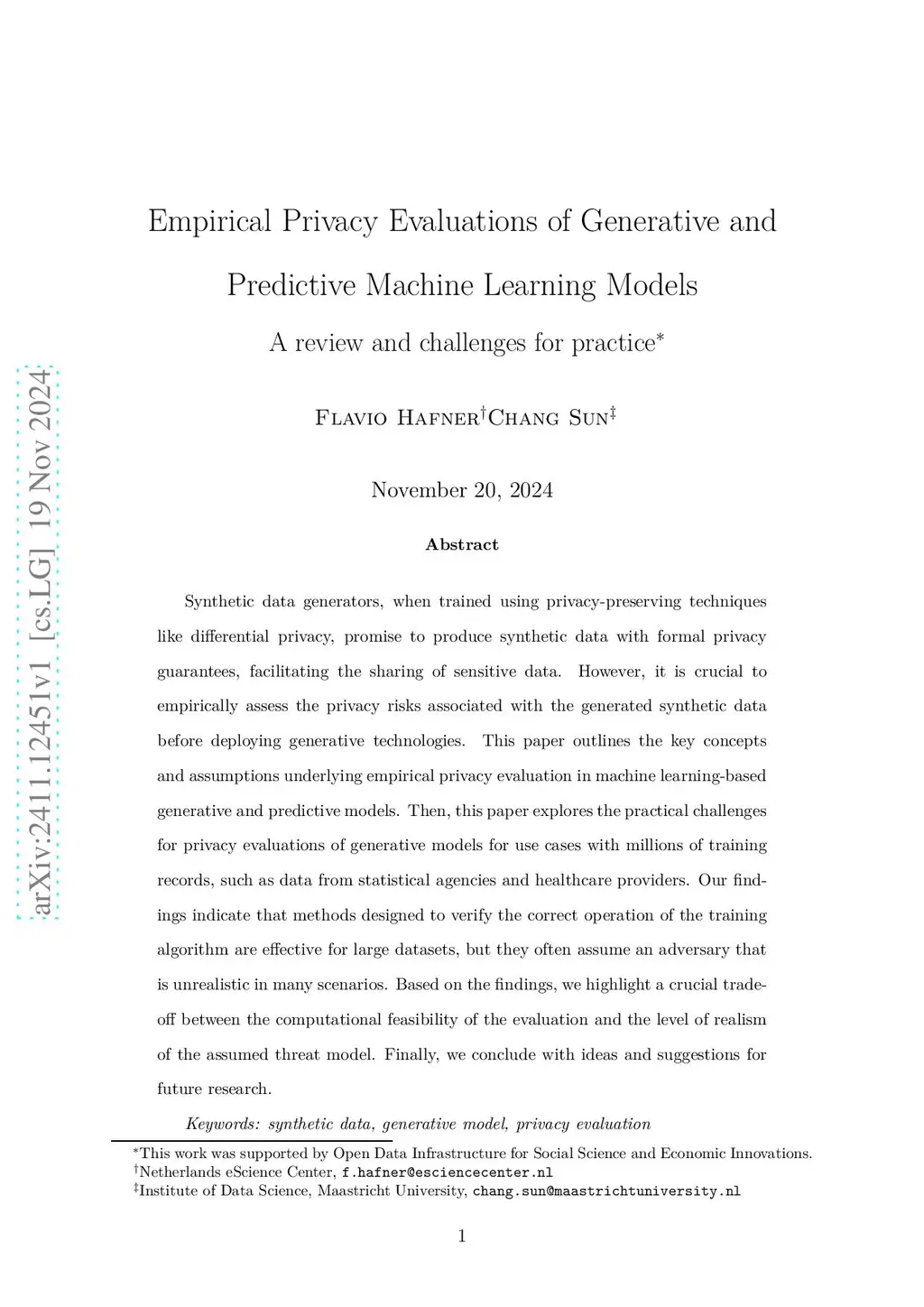 Synthetic data generators, when trained using privacy-preserving techniques like differential privacy, promise to produce synthetic data with formal privacy guarantees, facilitating the sharing of sensitive data. However, it is crucial to empirically assess the privacy risks associated with the generated synthetic data before deploying generative technologies. This paper outlines the key concepts and assumptions underlying empirical privacy evaluation in machine learning-based generative and predictive models. Then, this paper explores the practical challenges for privacy evaluations of generative models for use cases with millions of training records, such as data from statistical agencies and healthcare providers. Our findings indicate that methods designed to verify the correct operation of the training algorithm are effective for large datasets, but they often assume an adversary that is unrealistic in many scenarios. Based on the findings, we highlight a crucial trade-off between the computational feasibility of the evaluation and the level of realism of the assumed threat model. Finally, we conclude with ideas and suggestions for future research.