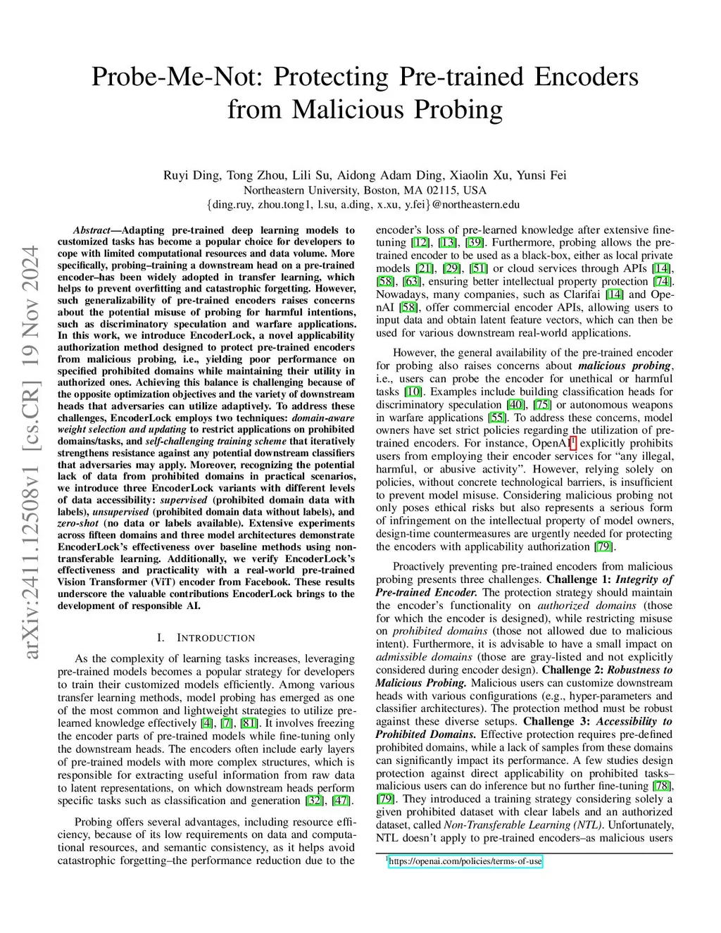 Adapting pre-trained deep learning models to customized tasks has become a popular choice for developers to cope with limited computational resources and data volume. More specifically, probing--training a downstream head on a pre-trained encoder--has been widely adopted in transfer learning, which helps to prevent overfitting and catastrophic forgetting. However, such generalizability of pre-trained encoders raises concerns about the potential misuse of probing for harmful intentions, such as discriminatory speculation and warfare applications. In this work, we introduce EncoderLock, a novel applicability authorization method designed to protect pre-trained encoders from malicious probing, i.e., yielding poor performance on specified prohibited domains while maintaining their utility in authorized ones. Achieving this balance is challenging because of the opposite optimization objectives and the variety of downstream heads that adversaries can utilize adaptively. To address these challenges, EncoderLock employs two techniques: domain-aware weight selection and updating to restrict applications on prohibited domains/tasks, and self-challenging training scheme that iteratively strengthens resistance against any potential downstream classifiers that adversaries may apply. Moreover, recognizing the potential lack of data from prohibited domains in practical scenarios, we introduce three EncoderLock variants with different levels of data accessibility: supervised (prohibited domain data with labels), unsupervised (prohibited domain data without labels), and zero-shot (no data or labels available). We verify EncoderLock's effectiveness and practicality with a real-world pre-trained Vision Transformer (ViT) encoder from Facebook. These results underscore the valuable contributions EncoderLock brings to the development of responsible AI.