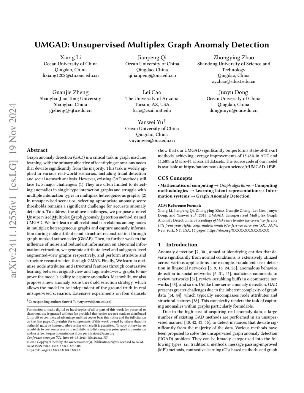 UMGAD: Unsupervised Multiplex Graph Anomaly Detection