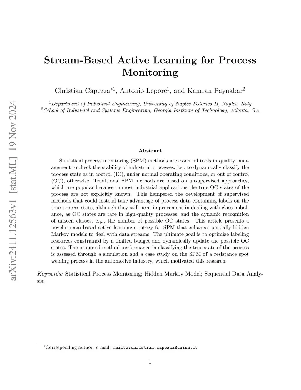 Statistical process monitoring (SPM) methods are essential tools in quality management to check the stability of industrial processes, i.e., to dynamically classify the process state as in control (IC), under normal operating conditions, or out of control (OC), otherwise. Traditional SPM methods are based on unsupervised approaches, which are popular because in most industrial applications the true OC states of the process are not explicitly known. This hampered the development of supervised methods that could instead take advantage of process data containing labels on the true process state, although they still need improvement in dealing with class imbalance, as OC states are rare in high-quality processes, and the dynamic recognition of unseen classes, e.g., the number of possible OC states. This article presents a novel stream-based active learning strategy for SPM that enhances partially hidden Markov models to deal with data streams. The ultimate goal is to optimize labeling resources constrained by a limited budget and dynamically update the possible OC states. The proposed method performance in classifying the true state of the process is assessed through a simulation and a case study on the SPM of a resistance spot welding process in the automotive industry, which motivated this research.