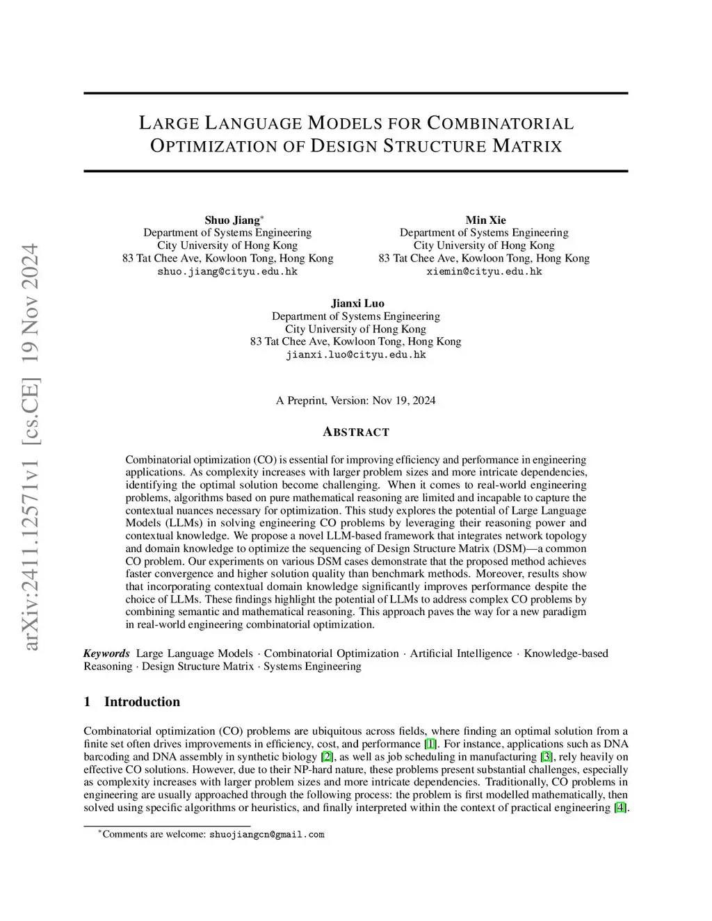 Combinatorial optimization (CO) is essential for improving efficiency and performance in engineering applications. As complexity increases with larger problem sizes and more intricate dependencies, identifying the optimal solution become challenging. When it comes to real-world engineering problems, algorithms based on pure mathematical reasoning are limited and incapable to capture the contextual nuances necessary for optimization. This study explores the potential of Large Language Models (LLMs) in solving engineering CO problems by leveraging their reasoning power and contextual knowledge. We propose a novel LLM-based framework that integrates network topology and domain knowledge to optimize the sequencing of Design Structure Matrix (DSM)-a common CO problem. Our experiments on various DSM cases demonstrate that the proposed method achieves faster convergence and higher solution quality than benchmark methods. Moreover, results show that incorporating contextual domain knowledge significantly improves performance despite the choice of LLMs. These findings highlight the potential of LLMs in tackling complex real-world CO problems by combining semantic and mathematical reasoning. This approach paves the way for a new paradigm in in real-world combinatorial optimization.