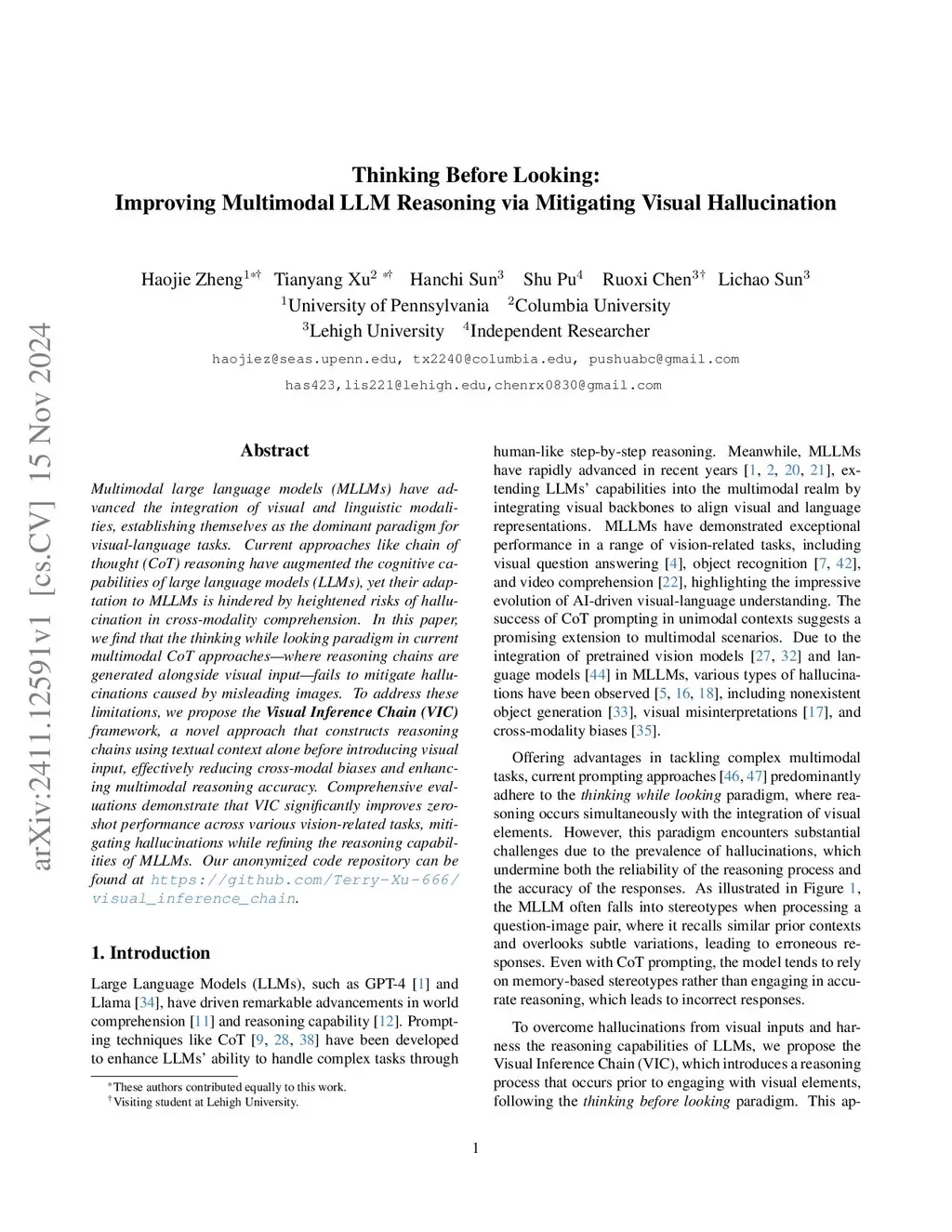 Multimodal large language models (MLLMs) have advanced the integration of visual and linguistic modalities, establishing themselves as the dominant paradigm for visual-language tasks. Current approaches like chain of thought (CoT) reasoning have augmented the cognitive capabilities of large language models (LLMs), yet their adaptation to MLLMs is hindered by heightened risks of hallucination in cross-modality comprehension. In this paper, we find that the thinking while looking paradigm in current multimodal CoT approaches--where reasoning chains are generated alongside visual input--fails to mitigate hallucinations caused by misleading images. To address these limitations, we propose the Visual Inference Chain (VIC) framework, a novel approach that constructs reasoning chains using textual context alone before introducing visual input, effectively reducing cross-modal biases and enhancing multimodal reasoning accuracy. Comprehensive evaluations demonstrate that VIC significantly improves zero-shot performance across various vision-related tasks, mitigating hallucinations while refining the reasoning capabilities of MLLMs. Our code repository can be found at https://github.com/Terry-Xu-666/visual_inference_chain.