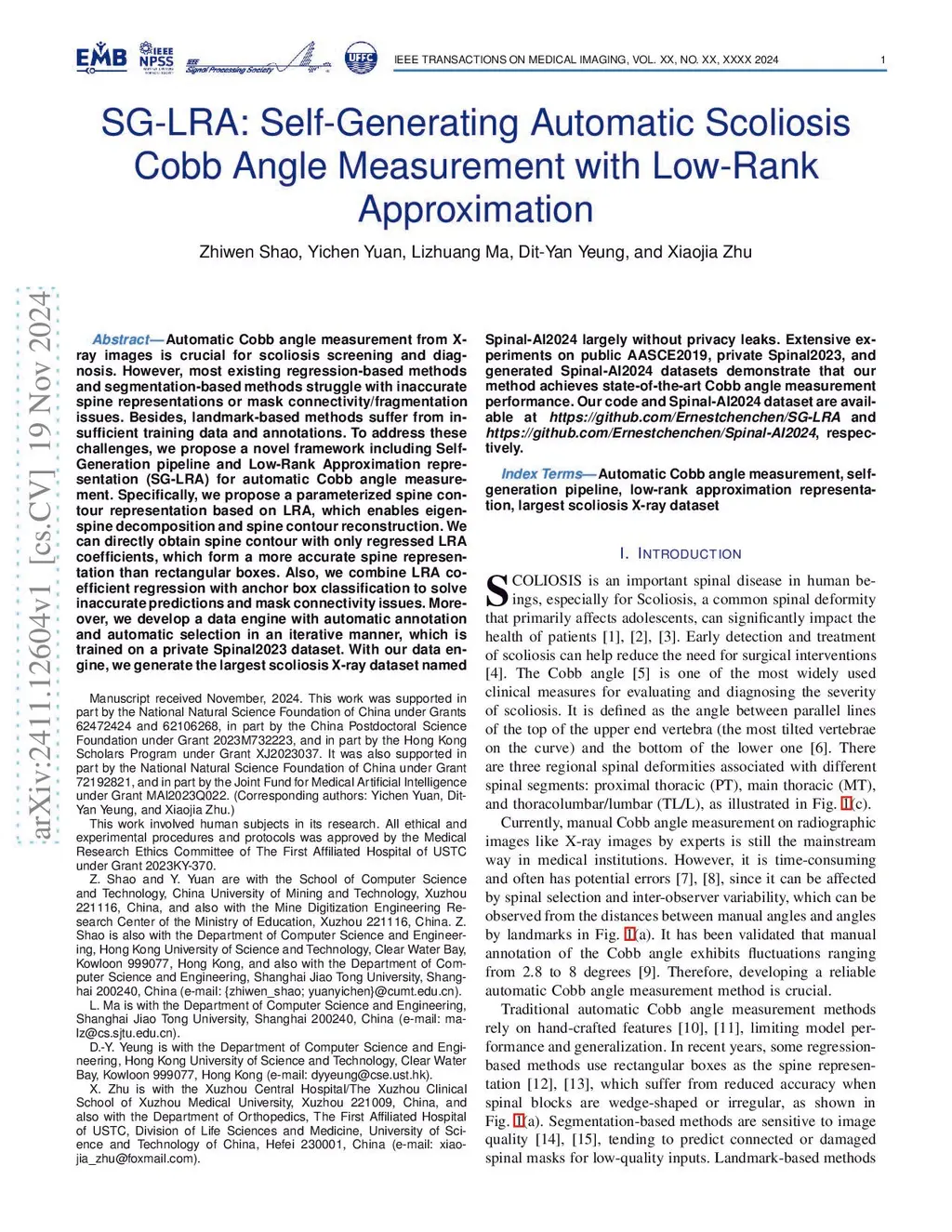 Curvature angle is a quantitative measurement of a curve, in which Cobb angle is customized for spinal curvature. Automatic Cobb angle measurement from X-ray images is crucial for scoliosis screening and diagnosis. However, most existing regression-based and segmentation-based methods struggle with inaccurate spine representations or mask connectivity and fragmentation issues. Besides, landmark-based methods suffer from insufficient training data and annotations. To address these challenges, we propose a novel curvature angle estimation framework named CurvNet including latent contour representation based contour detection and iterative data engine based image self-generation. Specifically, we propose a parameterized spine contour representation in latent space, which enables eigen-spine decomposition and spine contour reconstruction. Latent contour coefficient regression is combined with anchor box classification to solve inaccurate predictions and mask connectivity issues. Moreover, we develop a data engine with image self-generation, automatic annotation, and automatic selection in an iterative manner. By our data engine, we generate a clean dataset named Spinal-AI2024 without privacy leaks, which is the largest released scoliosis X-ray dataset to our knowledge. Extensive experiments on public AASCE2019, our private Spinal2023, and our generated Spinal-AI2024 datasets demonstrate that our method achieves state-of-the-art Cobb angle estimation performance. Our code and Spinal-AI2024 dataset are available atthis https URLandthis https URL, respectively.