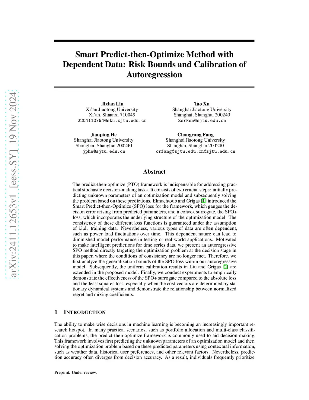 The predict-then-optimize (PTO) framework is indispensable for addressing practical stochastic decision-making tasks. It consists of two crucial steps: initially predicting unknown parameters of an optimization model and subsequently solving the problem based on these predictions. Elmachtoub and Grigas [1] introduced the Smart Predict-then-Optimize (SPO) loss for the framework, which gauges the decision error arising from predicted parameters, and a convex surrogate, the SPO+ loss, which incorporates the underlying structure of the optimization model. The consistency of these different loss functions is guaranteed under the assumption of i.i.d. training data. Nevertheless, various types of data are often dependent, such as power load fluctuations over time. This dependent nature can lead to diminished model performance in testing or real-world applications. Motivated to make intelligent predictions for time series data, we present an autoregressive SPO method directly targeting the optimization problem at the decision stage in this paper, where the conditions of consistency are no longer met. Therefore, we first analyze the generalization bounds of the SPO loss within our autoregressive model. Subsequently, the uniform calibration results in Liu and Grigas [2] are extended in the proposed model. Finally, we conduct experiments to empirically demonstrate the effectiveness of the SPO+ surrogate compared to the absolute loss and the least squares loss, especially when the cost vectors are determined by stationary dynamical systems and demonstrate the relationship between normalized regret and mixing coefficients.