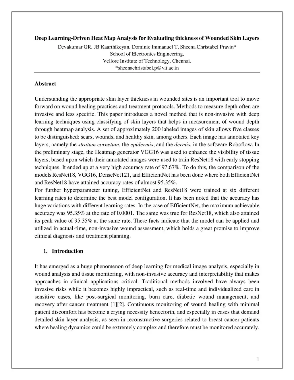 Understanding the appropriate skin layer thickness in wounded sites is an important tool to move forward on wound healing practices and treatment protocols. Methods to measure depth often are invasive and less specific. This paper introduces a novel method that is non-invasive with deep learning techniques using classifying of skin layers that helps in measurement of wound depth through heatmap analysis. A set of approximately 200 labeled images of skin allows five classes to be distinguished: scars, wounds, and healthy skin, among others. Each image has annotated key layers, namely the stratum cornetum, the epidermis, and the dermis, in the software Roboflow. In the preliminary stage, the Heatmap generator VGG16 was used to enhance the visibility of tissue layers, based upon which their annotated images were used to train ResNet18 with early stopping techniques. It ended up at a very high accuracy rate of 97.67%. To do this, the comparison of the models ResNet18, VGG16, DenseNet121, and EfficientNet has been done where both EfficientNet and ResNet18 have attained accuracy rates of almost 95.35%. For further hyperparameter tuning, EfficientNet and ResNet18 were trained at six different learning rates to determine the best model configuration. It has been noted that the accuracy has huge variations with different learning rates. In the case of EfficientNet, the maximum achievable accuracy was 95.35% at the rate of 0.0001. The same was true for ResNet18, which also attained its peak value of 95.35% at the same rate. These facts indicate that the model can be applied and utilized in actual-time, non-invasive wound assessment, which holds a great promise to improve clinical diagnosis and treatment planning.