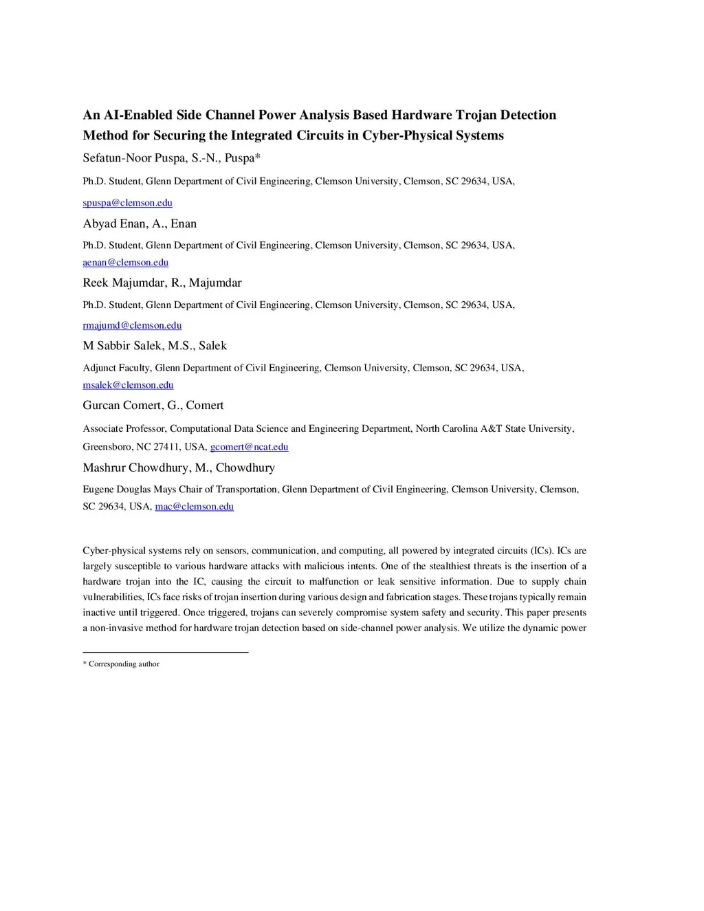 An AI-Enabled Side Channel Power Analysis Based Hardware Trojan