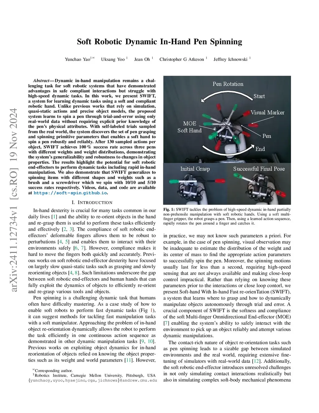 Soft Robotic Dynamic In-Hand Pen Spinning